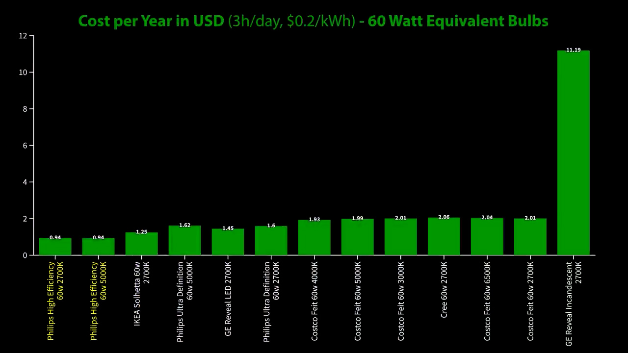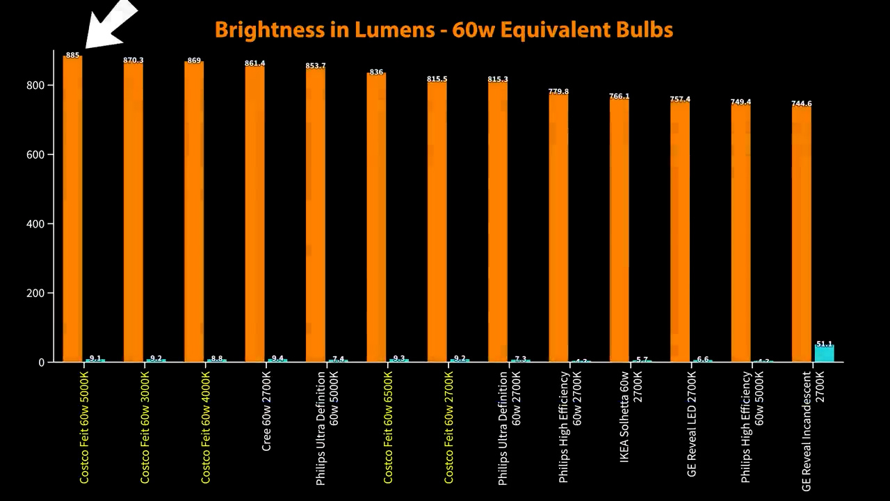 For the 60W equivalent bulbs the Costco Feit Electric bulbs were the brightest with around 870 lumens, but they did draw significantly more power than the rest of the bulbs at around 9.2 watts average. While the most efficient bulbs were predictably the Philips High Efficiency model that topped the charts at 181 lumens per watt for the soft white, and 174 lumens per watt for the daylight version, which means that they’d have a yearly operating cost of less than $1 based on three hours a day and 20 cents per kilowatt hour.