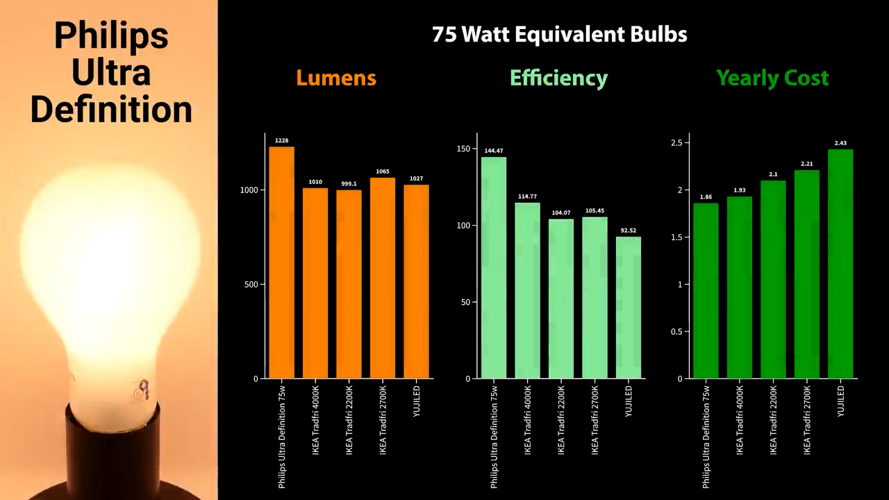 For the 75W equivalent bulbs the Philips Ultra Definition bulb was the brightest at 1228 lumens, and the most efficient at 144 lumens per watt for a yearly operating cost of $1.86.