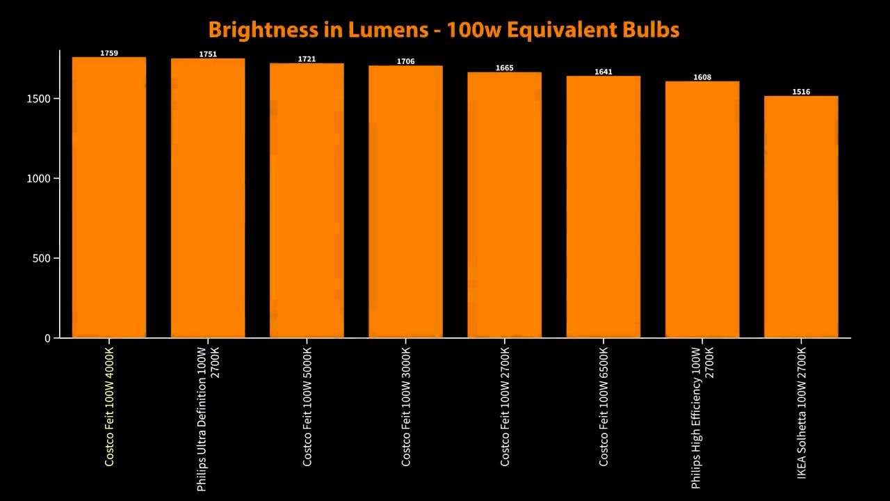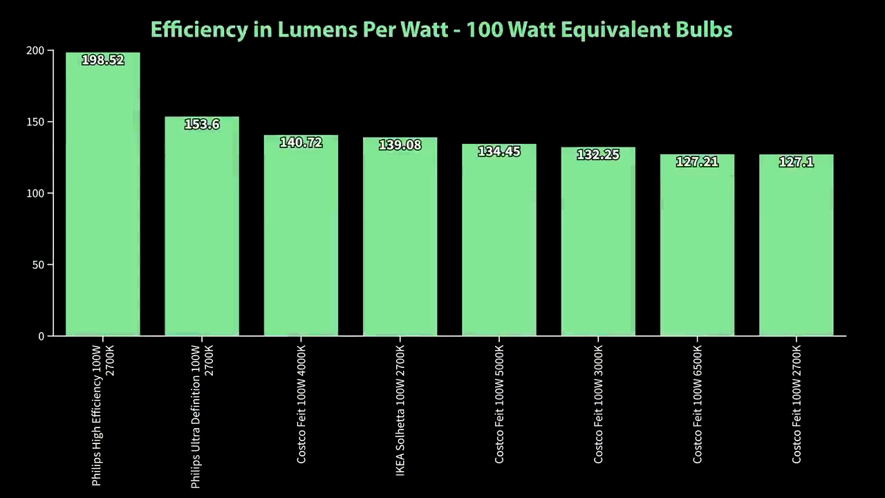 And for the 100W bulbs the Feit Electric bulbs from Costco topped the list for brightness again at 1759 lumens for the 3000K color temperature, but the Philips Ultra Definition was close behind at 1751 lumens, and for efficiency both of the Philips bulbs came out on top with the high efficiency model at 198 lumens per watt, and the Ultra Definition model at 153 lumens per watt, for a yearly operating cost of $1.77 and $2.50.