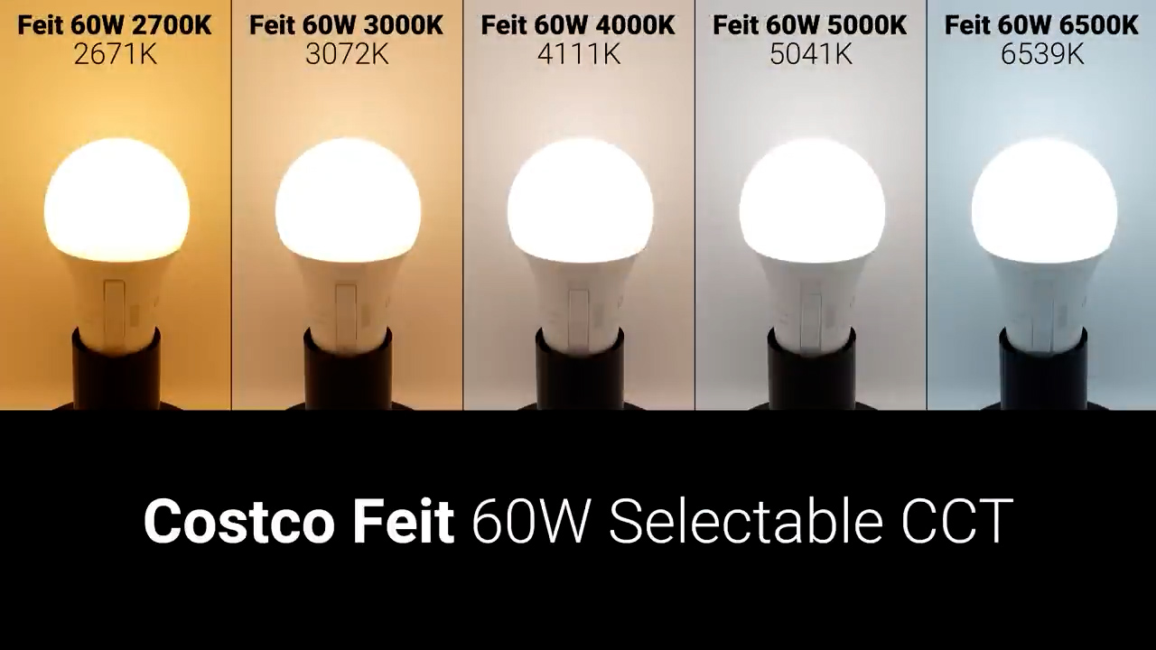 Also from Feit Electric, at Costco I bought both the 60W and 100W adjustable color temperature bulbs, that also have a switch on the base to select one of their five preset color temperatures ranging from 2700K to 6500K.