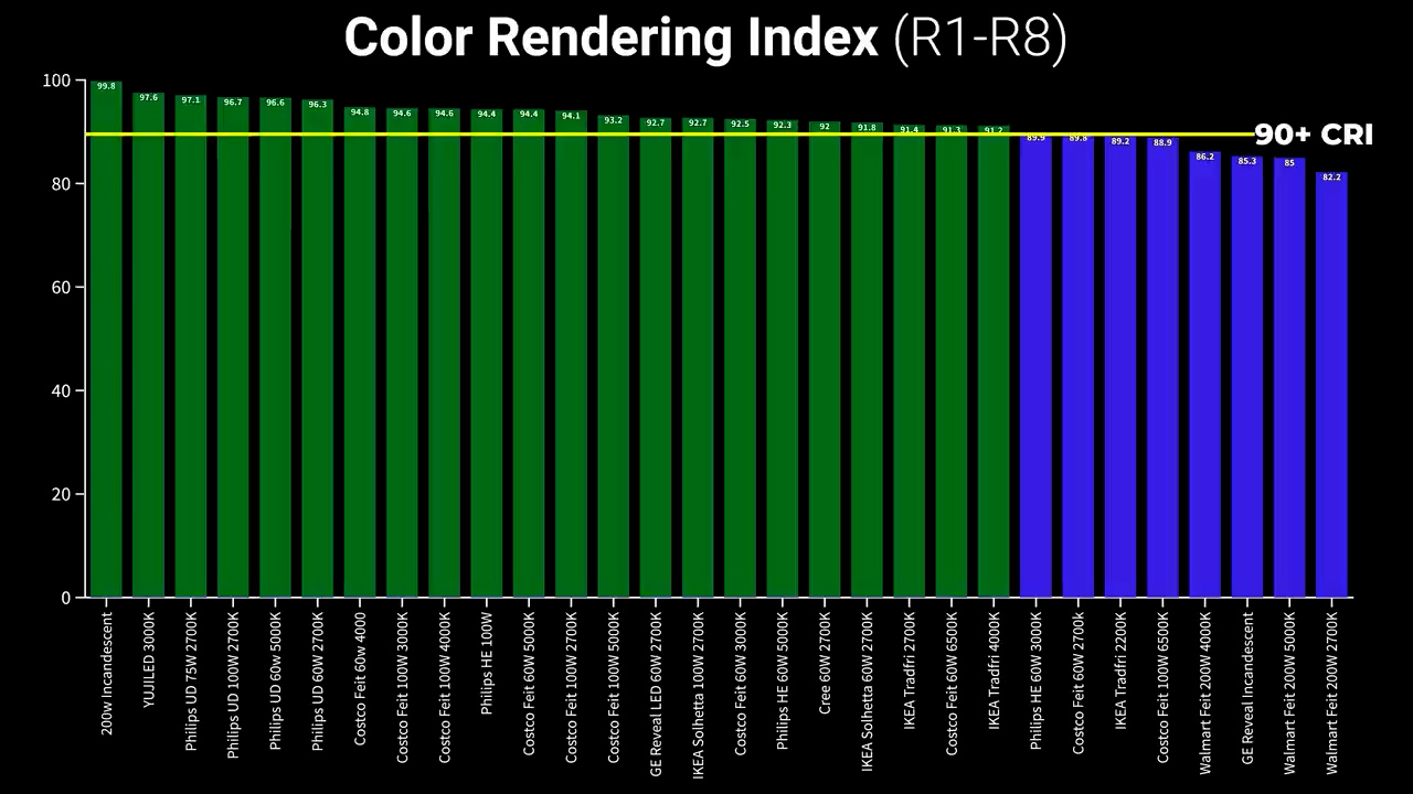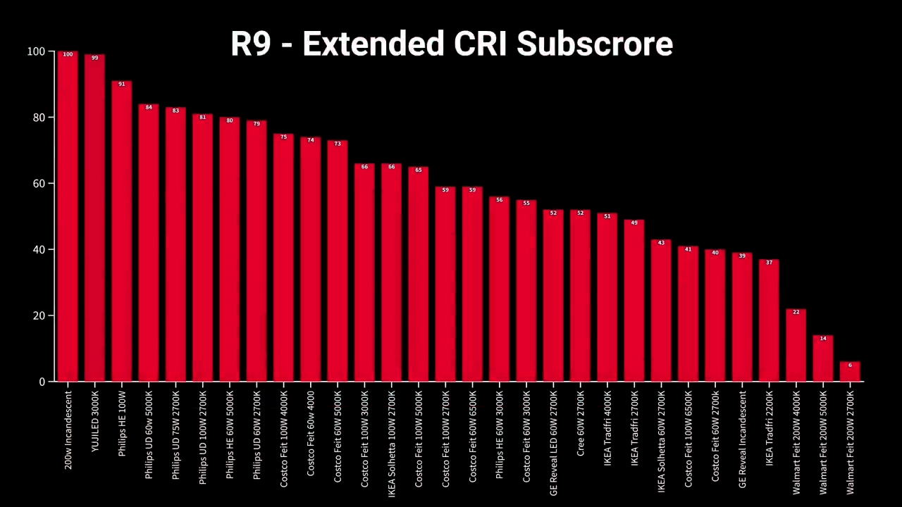 CRI specifically measures colors from R1 to R8, but extended CRI includes other more vibrant colors and one in particular, R9, is typically hard for LEDs to render but is important for accurately lighting human skin tones, and you can see that the YUJILED had an excellent R9 subscore of 99, while the Ultra Definition and High Efficiency bulbs from Philips also had very respectable R9 scores between 80 and 91.