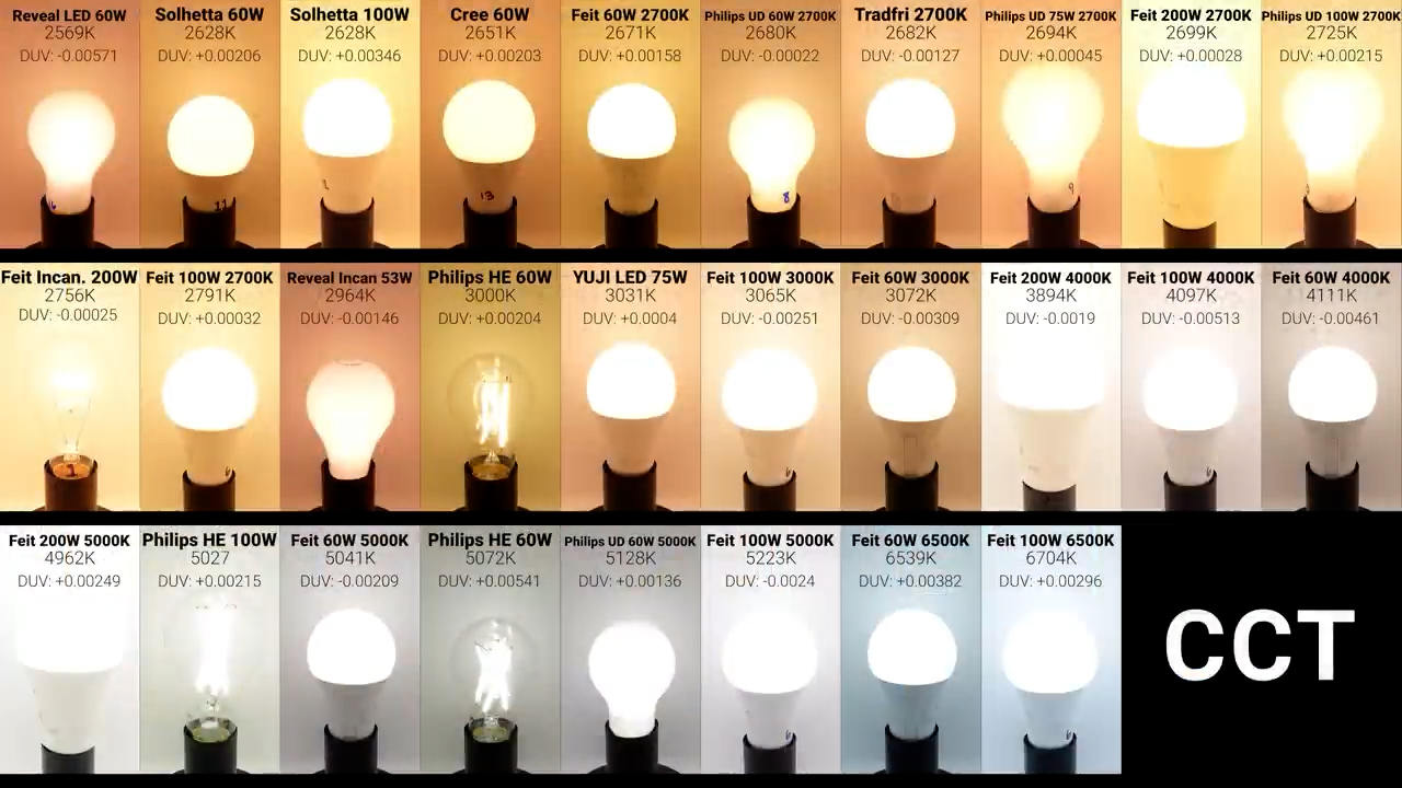 Here are the color temperatures and DUV values for all the bulbs arranged by color temperature,