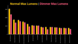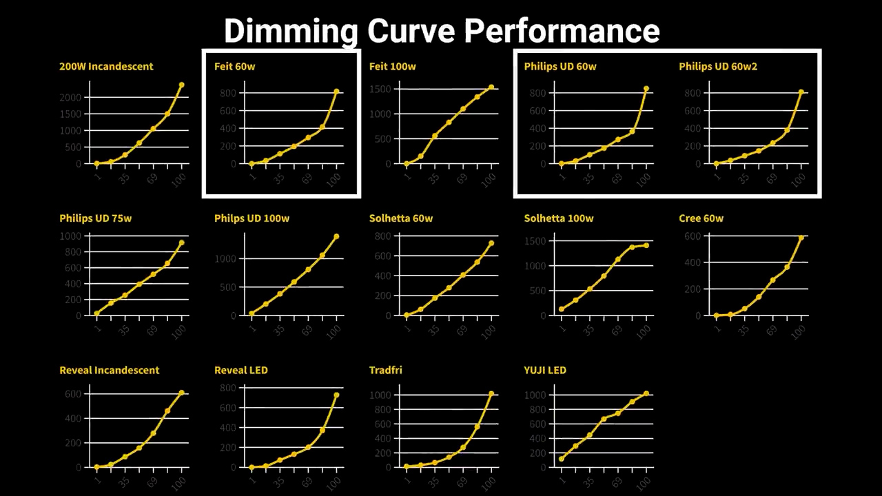 Speaking of dimming, I also tested each bulb’s dimming curve using a standard Lutron dimmer from Home Depot, and the results were interesting. Human perception of brightness is logarithmic, meaning going from 500 lumens to 2000 lumens will only appear twice as bright to our eyes, and as a result you want the dimming graph to be curved, not straight, and the brightness at 100% should be about four times the brightness in lumens at 50%, and both of the 60W Philips Ultra Definition bulbs and the Feit Electric 60W bulbs had almost perfect dimming curves as well as a minimum stable brightness under five lumens.