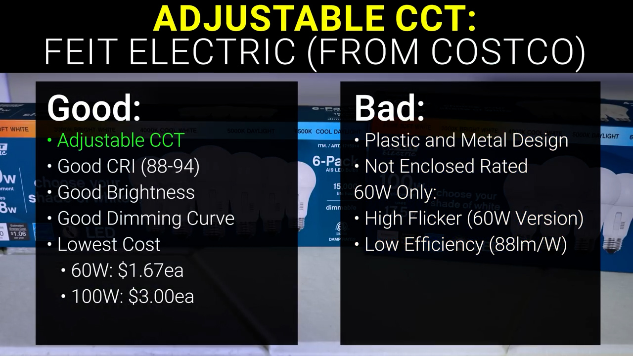 The 60W Feit bulbs from Costco had more flicker than I’d like but had very decent CRI and brightness especially for $1.67 each, while the 100W Feit bulbs had much better flicker and efficiency with the tradeoff of higher cost. Unfortunately, while they do specifically say they are damp rated, neither the 60W or 100W boxes say anything about enclosed fixtures or downlighting, and the older style plastic and aluminum construction tends to get much hotter than the newer all glass design, not to mention the fact that the glass bulbs do a much better job of evenly lighting an area rather than just emitting light in a single direction.