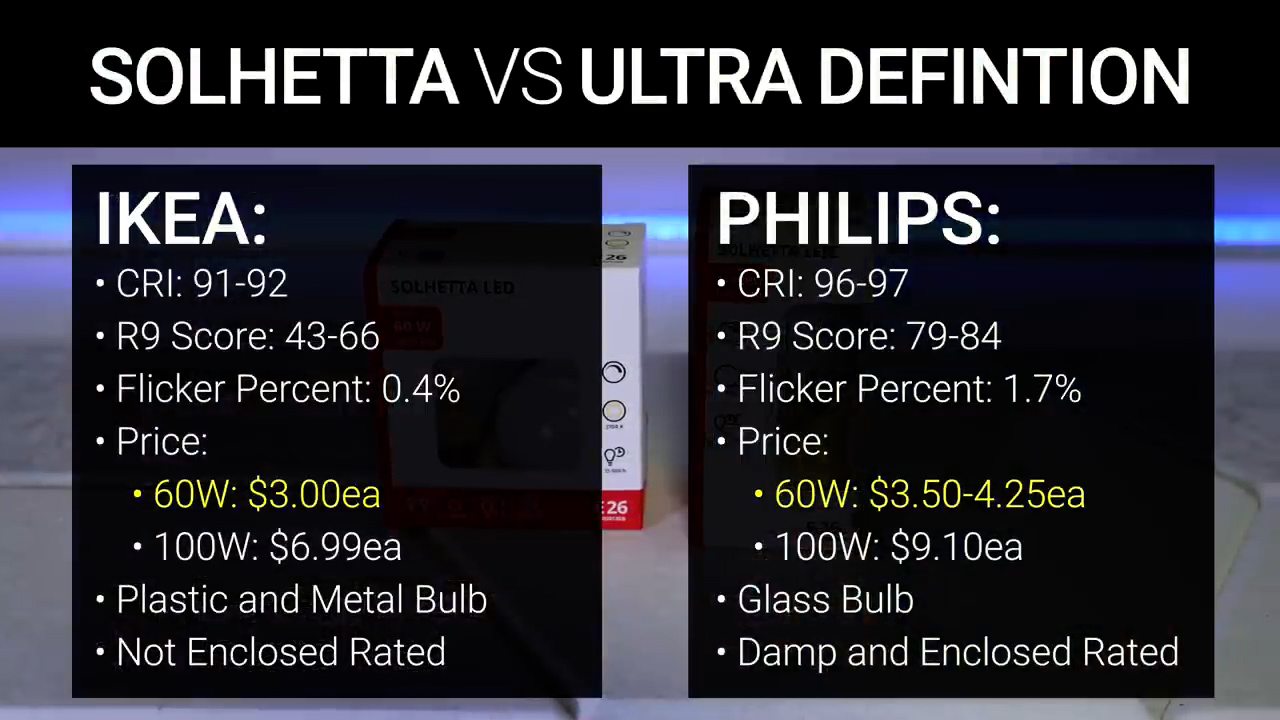 The IKEA Solhetta bulbs were fine I guess and were better than most of the ultra-budget brands on Amazon, but at my IKEA they’re still pretty expensive at $3 a bulb and for me, saving less than a dollar per bulb over the Philips Ultra Definition series is definitely not worth the lower CRI and dimming performance, not to mention the plastic and metal construction and the fact that the 100W bulbs specifically say they aren’t rated for recessed or enclosed fixtures, and the 60W bulbs don’t say anything about fixture type at all.