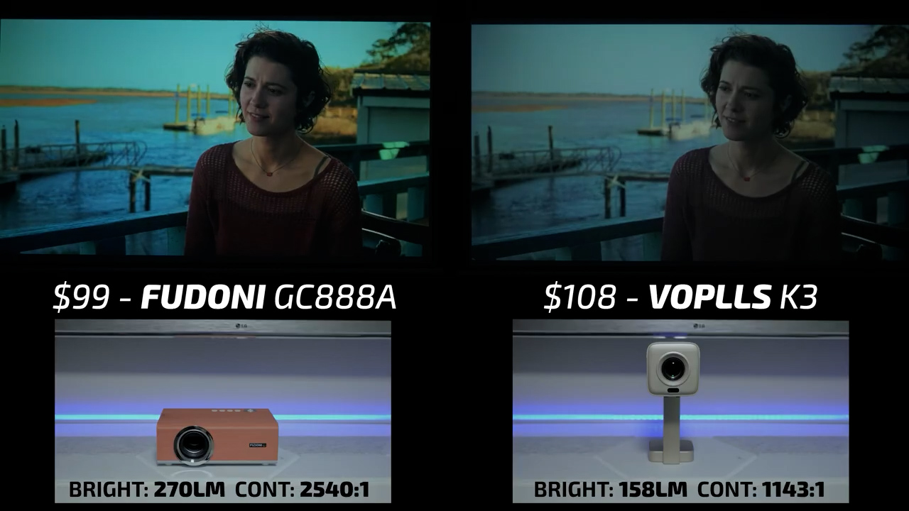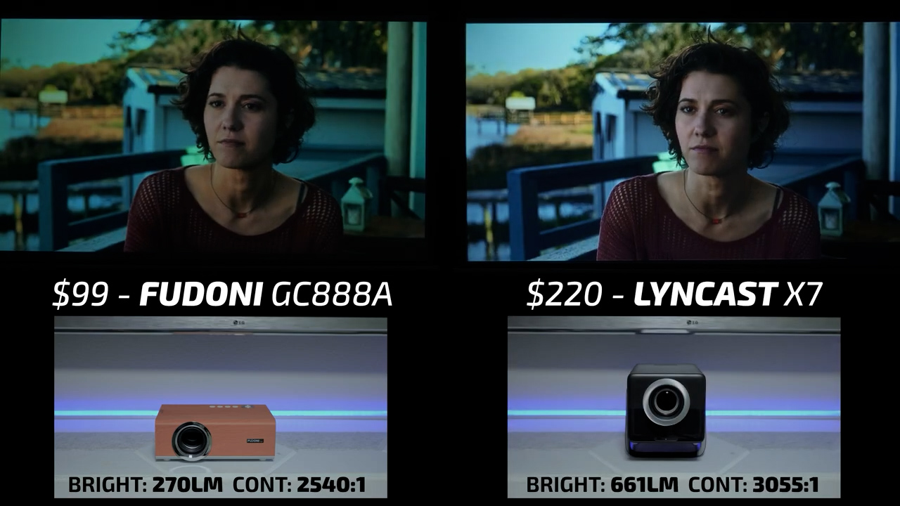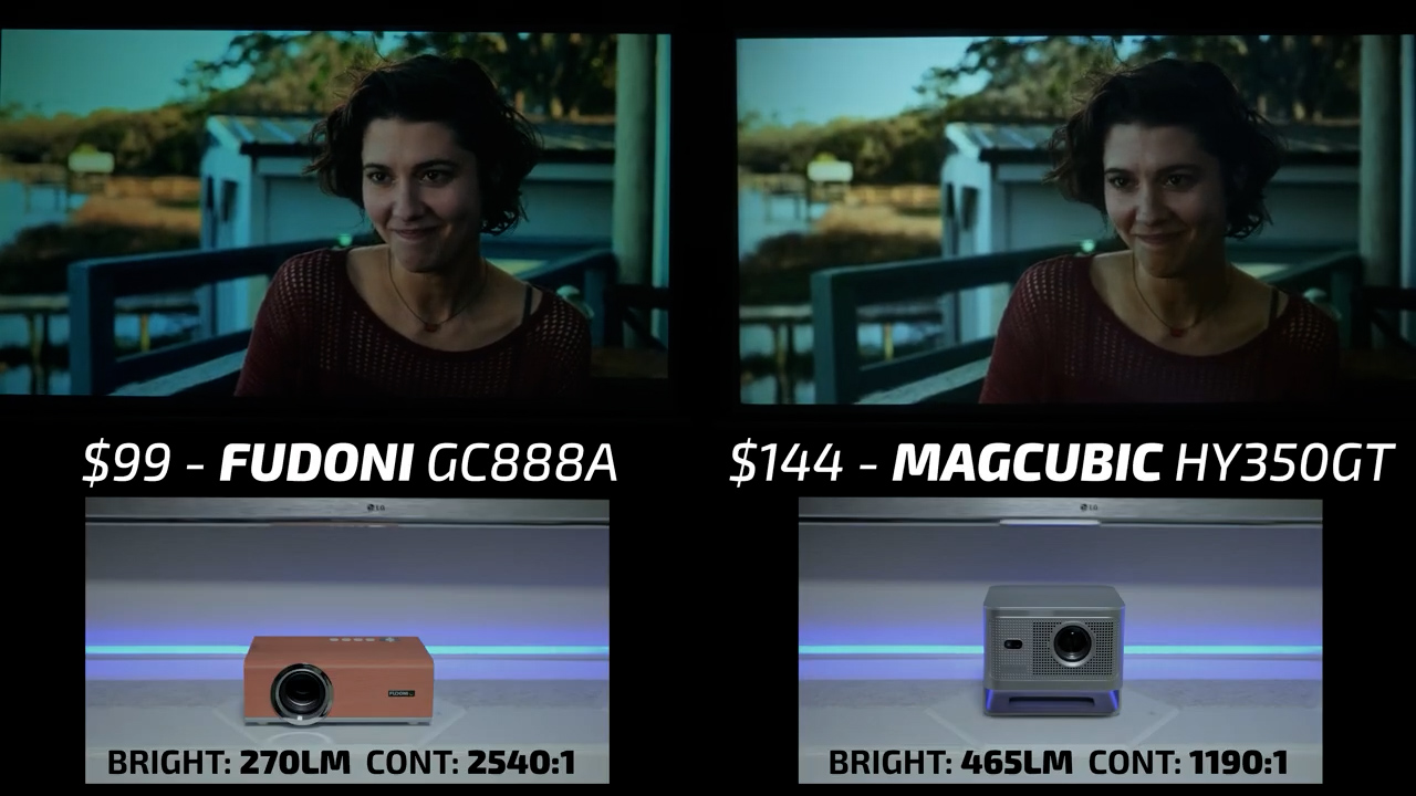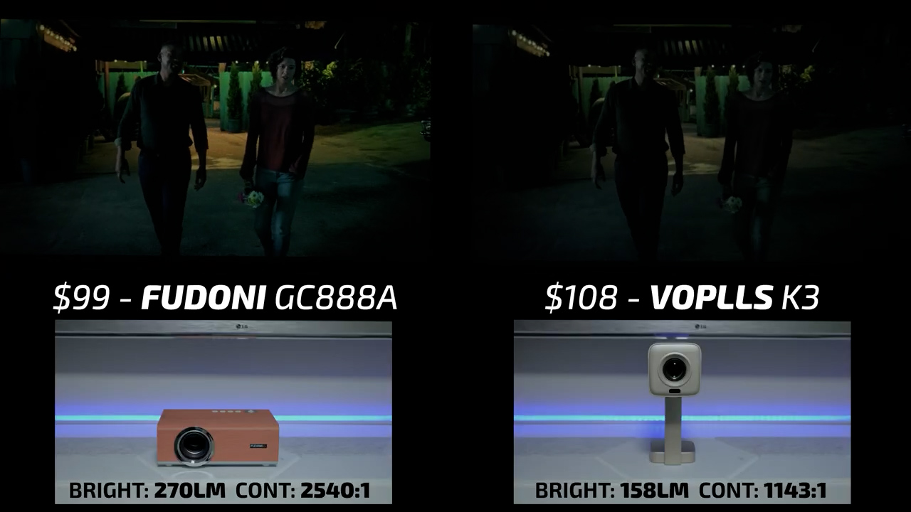 In round 4, the Fudoni is on the left and the $144 MagCubic HY350GT is on the right. In bright scenes, these two projectors were relatively similar, but I would give the slight edge to the Fudoni in terms of color accuracy and contrast, especially in Dani’s skin tone. However, in dark scenes, the HY350GT is one of the worst performing projectors I’ve ever tested and had all kinds of internal reflections casting blue streaks across the screen, so there is no question that the Fudoni won this round also.