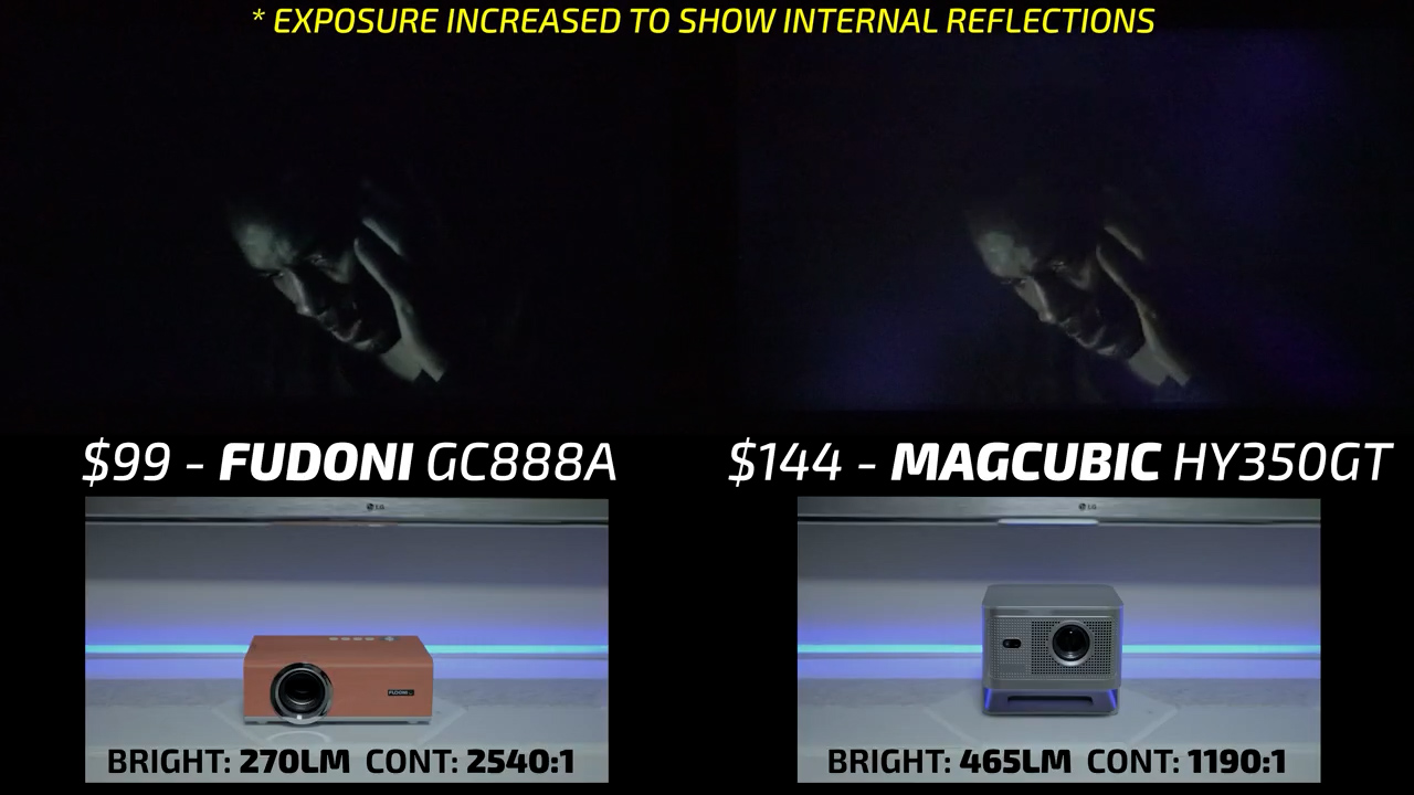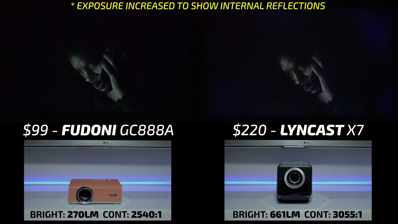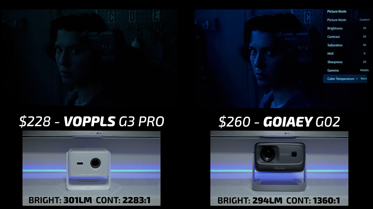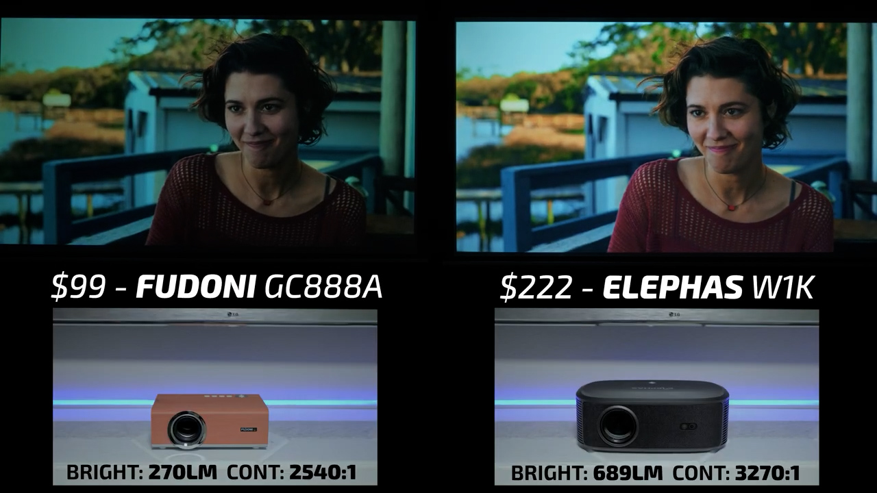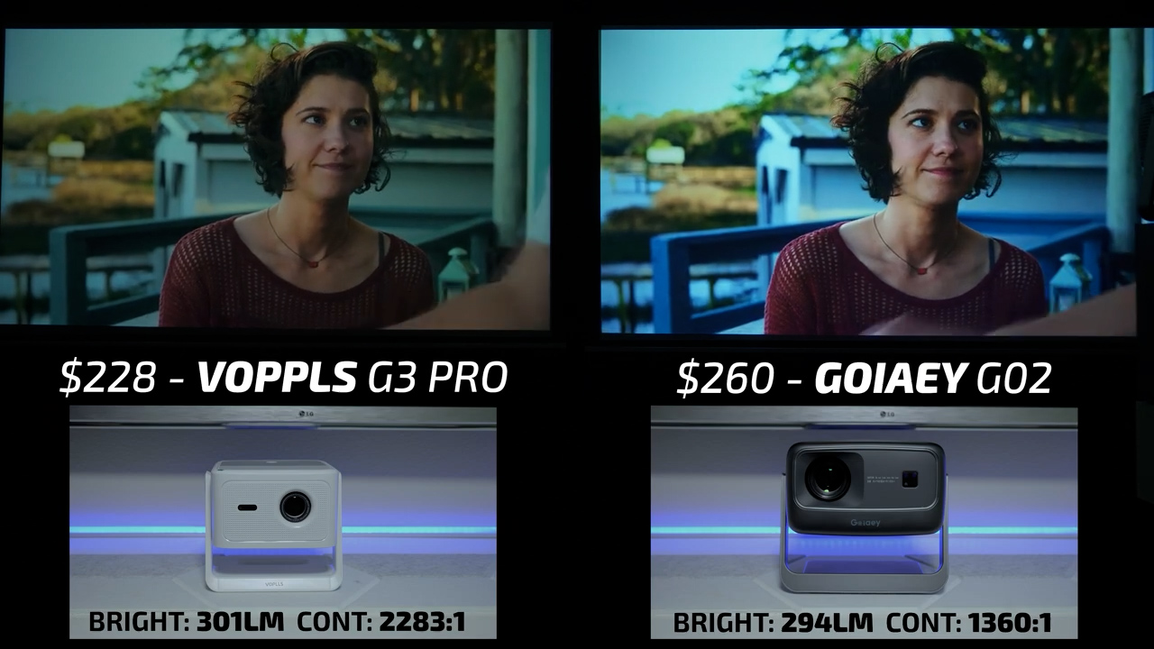 In round 4, the Fudoni is on the left and the $144 MagCubic HY350GT is on the right. In bright scenes, these two projectors were relatively similar, but I would give the slight edge to the Fudoni in terms of color accuracy and contrast, especially in Dani’s skin tone. However, in dark scenes, the HY350GT is one of the worst performing projectors I’ve ever tested and had all kinds of internal reflections casting blue streaks across the screen, so there is no question that the Fudoni won this round also.
