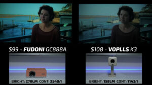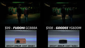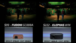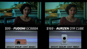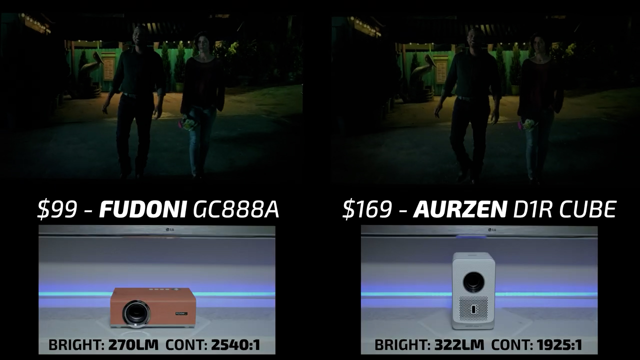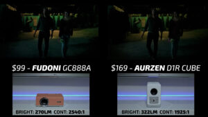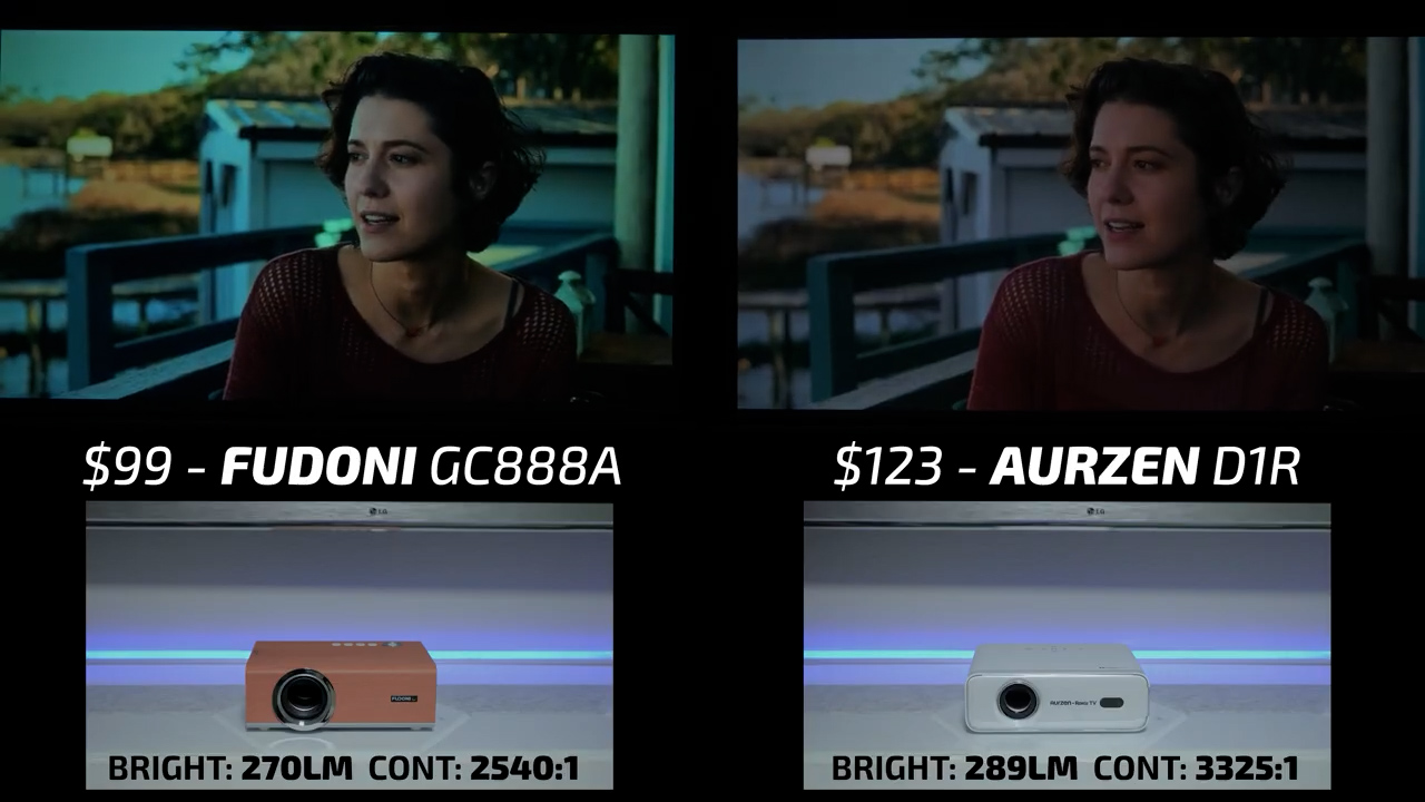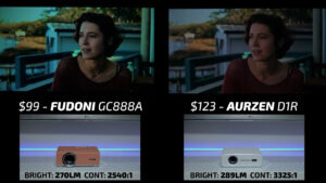 Round 3 then put the Fudoni on the left and the $123 Aurzen D1R on the right. While the Aurzen was pleasingly color-accurate, the overall picture quality felt flat and undersaturated compared to the Fudoni in bright scenes. In dark scenes, the gamma curve on the Fudoni was much more suited for a projector with under 300 lumens and despite the higher contrast ratio, the Aurzen lost a lot of shadow detail due to poor image processing making this another quick win for the Fudoni.