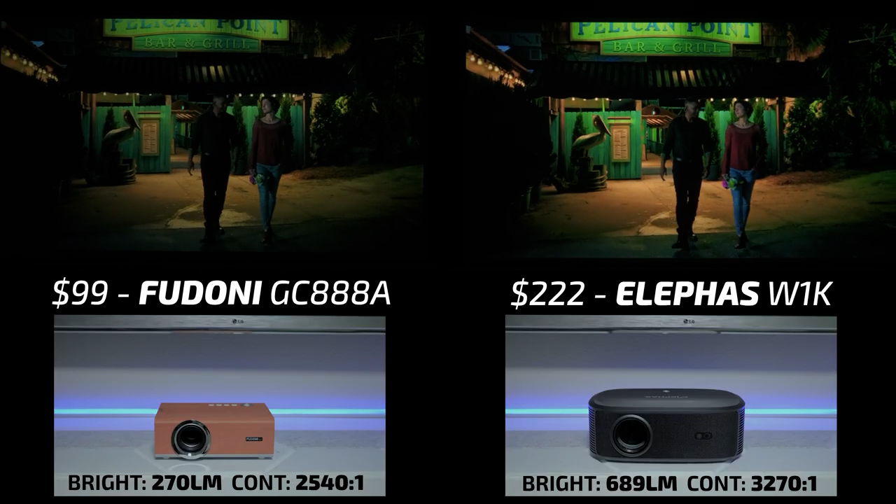 In round 7, the winner of this year’s $100 and under video, the Fudoni GC888A is still on the left, and the winner of last year’s $100-500 video, the $222 Elephas W1K is on the right. Finally, after six underwhelming rounds, there was a clear and significant improvement over the $99 Fudoni. In bright scenes, the Elephas was bright and vibrant if not slightly oversaturated, in moderately lit scenes the midtones were correctly processed to create a pleasing and easy to watch image, and in the darkest scenes the Elephas shifted slightly blue but was overall still a pleasure to watch with excellent black level and shadow detail making it a landslide winner in round 7.