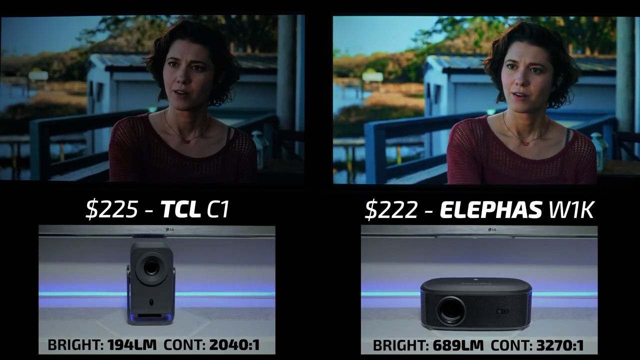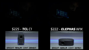 That makes round 8 the Elephas W1K on the right and the $225 TCL C1 on the left. In terms of image quality, these two projectors performed nearly identically in bright scenes except for the fact that the Elephas was over three times as bright. Dark scenes also went about how you would expect with both projectors showing excellent shadow detail, but the highlights on the Elephas were roughly three times brighter than the TCL making this another easy win for the Elephas.
