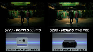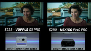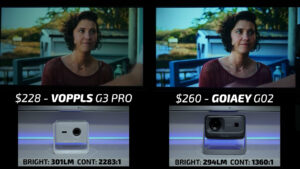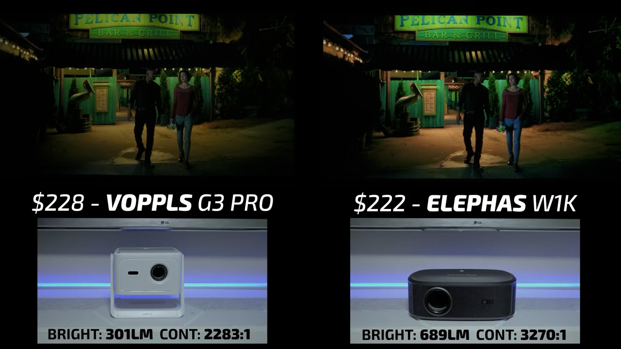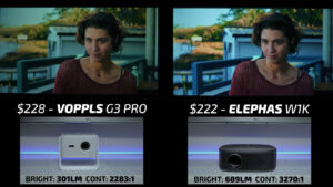 Round 9 then put the Elephas W1K on the right and the $228 VOPPLS G3 Pro on the left. One of the interesting things about the VOPPLS is that it doesn’t list the projector’s brightness anywhere on the product page. But in my testing, it came out to be just over 300 ANSI lumens, which is less than half of the Elephas. However, the VOPPLS color accuracy and tone mapping were some of the best I’ve ever seen at this price point, and despite having less than half the brightness it was able to deliver a very high-quality image in both bright and dark scenes. I significantly preferred the image on the VOPLLS for watching movies, but if you are more interested in using these projectors for sports, I think that the Elephas is still the better pick. But with that said, I’m going to give the win this round to the VOPLLS.