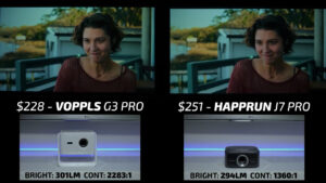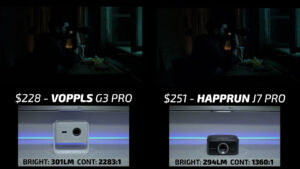 In round 10, the VOPPLS is on the left and the $251 Happrun J7 Pro is on the right. In bright content, the projectors were nearly identical with the VOPPLS having just a few extra lumens over the Happrun making it a very close matchup, but in darker scenes the black floor of the Happrun was substantially higher causing the image to look gray and washed out compared to the VOPPLS. So, the VOPPLS easily won this round.