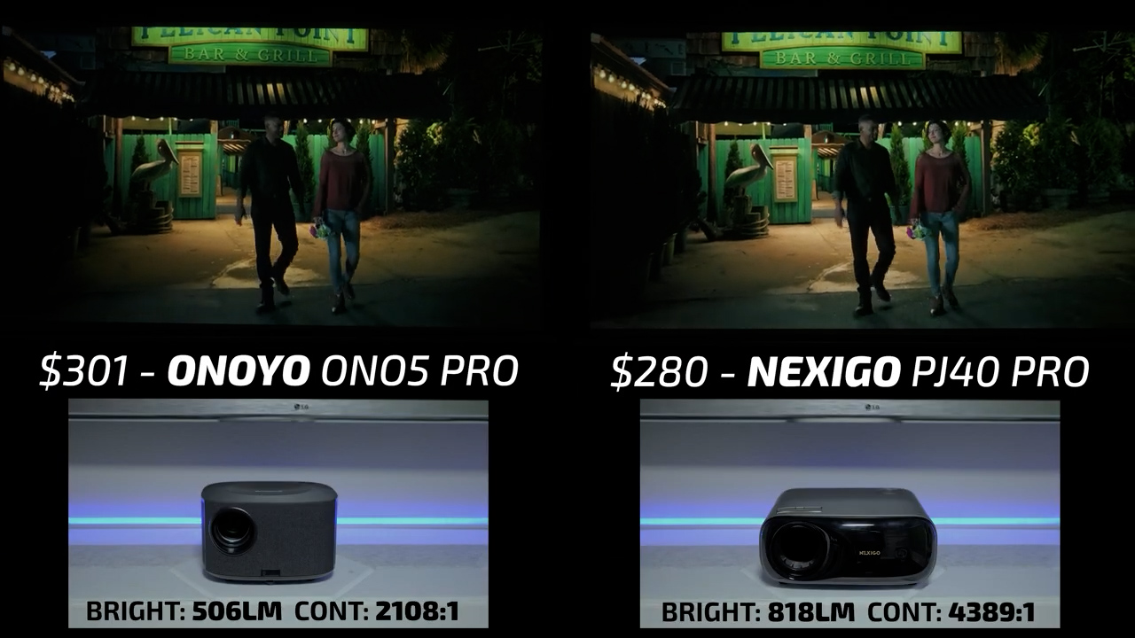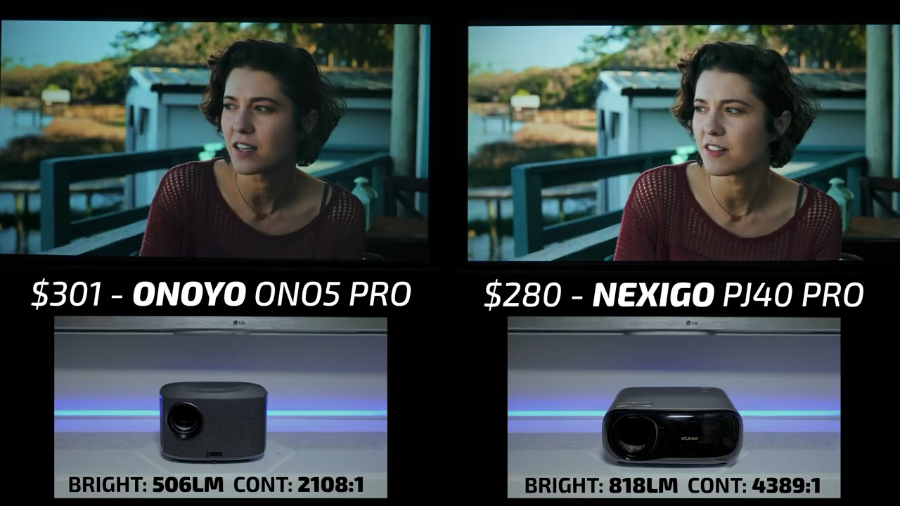 That makes round 13 the Nexigo PJ40 Pro on the right and the $301 ONOYO ONO5 Pro on the left. The ONO5 Pro is identical to the Happrun YG491 that I reviewed in 2024, which took 2nd place overall in the picture quality testing. Similar to 2024, I thought the ONO5 looked great with excellent, albeit slightly oversaturated color, good tone mapping, and decent contrast. But it was absolutely no match for the Nexigo, which as I said, is easily the best performing projector I’ve ever seen at this price point.