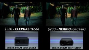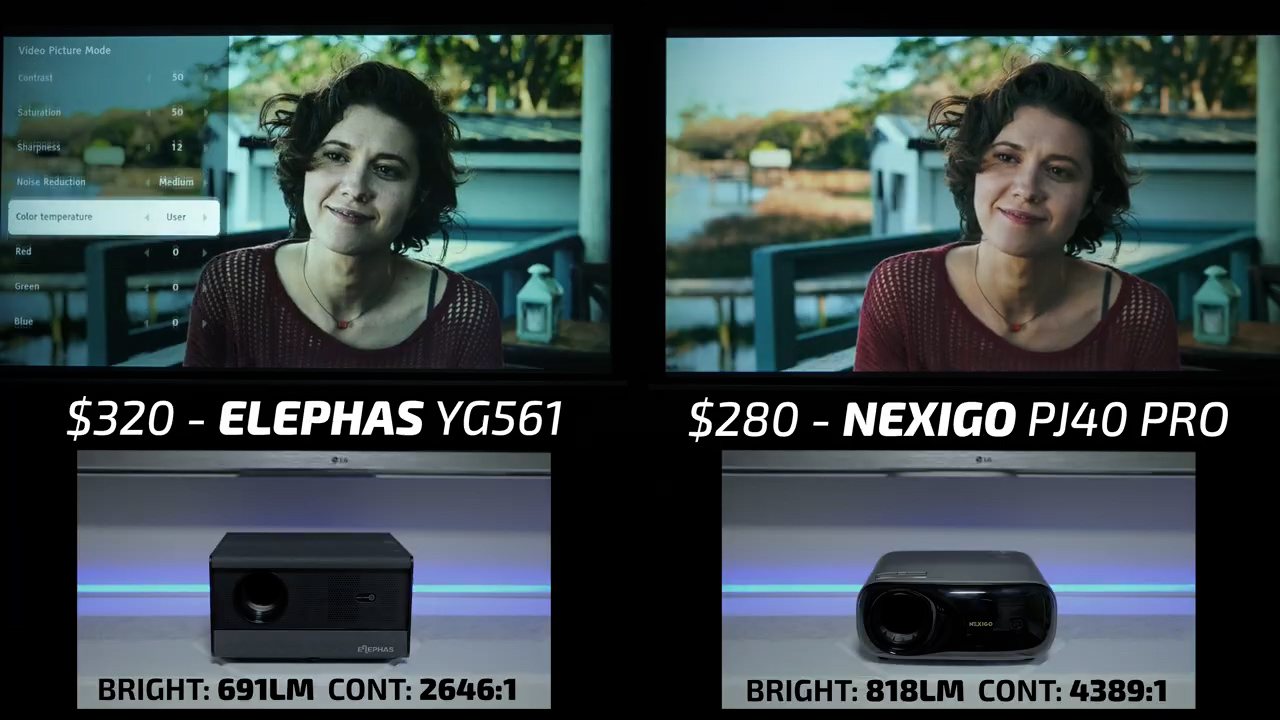 So, the final round is the Nexigo PJ40 Pro on the right and the $320 Elephas YG561 on the left. Straight out of the box, the picture settings on the Elephas were a hot mess, so I spent a little bit of time adjusting the white balance, brightness, and contrast to make this round somewhat of a fair fight. But no matter what I did, I couldn’t stop skin tones from looking sickly and it was almost like the Elephas was pushing all of the midtones into either highlights or shadows which I personally found very unappealing. Unfortunately, the Elephas YG561 lacked the proper advanced picture controls to be able to correct that issue, making the Nexigo PJ40 Pro the overall winner for picture quality in 2026 by a pretty large margin.