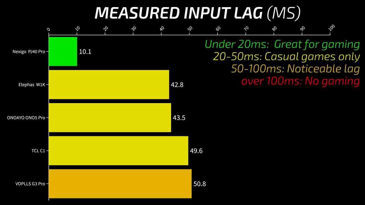 Next, it’s time to do some more in-depth testing on just the top five projectors, starting with input lag. Playing video games on a big screen is an awesome experience, but historically these single LCD projectors have had input lag values much too high for most video games. I used the industry standard Leo Bodnar lag tester to measure the input lag at 1080p60Hz for each projector and found that the Nexigo PJ40 Pro had a super impressive input lag time of just 10.1 ms when measured at the middle of the screen and just 3.3 ms when measured at the top, which is by far the lowest input lag I’ve ever measured on a single LCD and close to the lowest input lag I’ve measured, period. Compared to the other four projectors, the Nexigo PJ40 Pro is the clear choice and basically the only good option for someone who wants to use this projector for serious gaming.