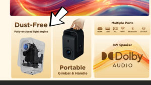 For the TCL, its low fan noise and lower brightness in comparison to its price is due to the fact that it is the only projector in this video that uses a fully sealed light engine, which should theoretically also prevent dust from getting onto the LCD screen where it will cause spots on the projected image. So, while other projectors have air filters, access ports to stick cotton swabs into the projector, and dust removal modes to dislodge any blobs on the screen, the TCL’s fully sealed light engine should just avoid them in the first place.