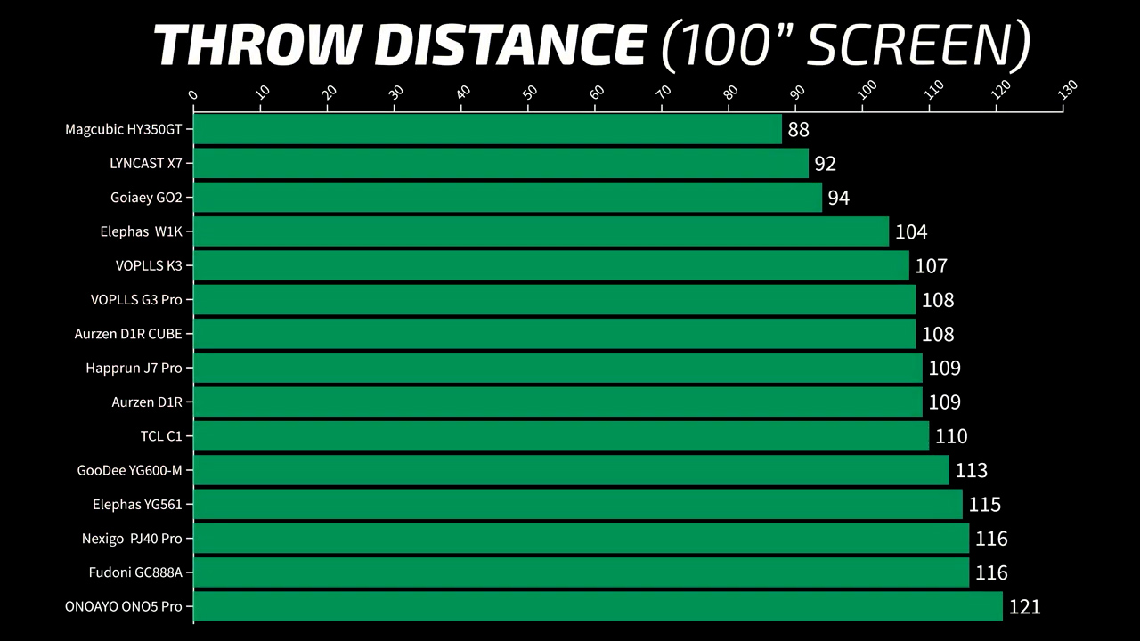 The last consideration before buying a single LCD projector is the throw, which describes the distance and positioning of the projector relative to the screen. You can see that the top five projectors all had very similar throw distances between 104 and 121” away from the screen to project a 100” screen. Here are the throw ratios, so if you know how wide of a screen you want to project, just multiply that number by the throw ratio and that will give you the distance you’ll need to place your projector away from the screen.