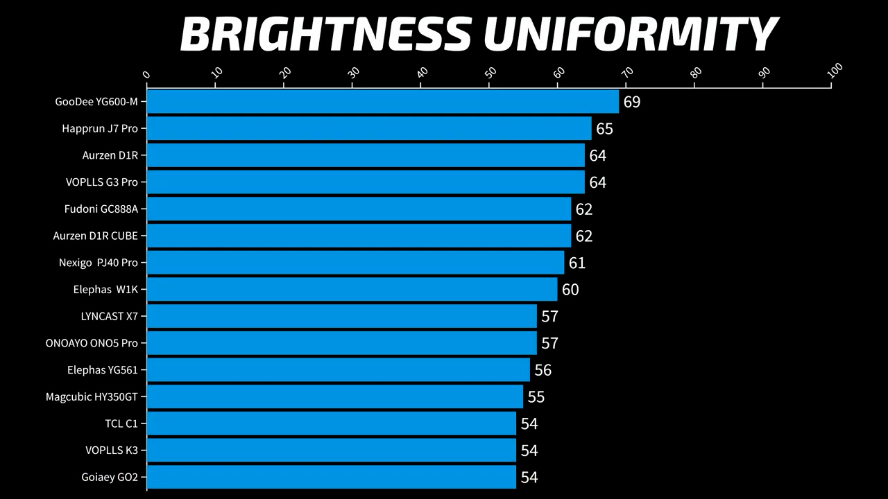 However, while single LCD projectors tend to have excellent contrast, they struggle with brightness uniformity and tend to be much dimmer in the corners than in the middle of the screen. This batch was no different and all came in between 69% and 54%, which is pretty bad compared to other projector technologies like DLP that are often more than 95% uniform.