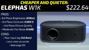 The Elephas W1K is also going to get an honorable mention for excellent brightness, contrast, and picture quality with substantially lower fan noise, but for those interested in the highest quality image I think the PJ40 Pro is still the better choice.