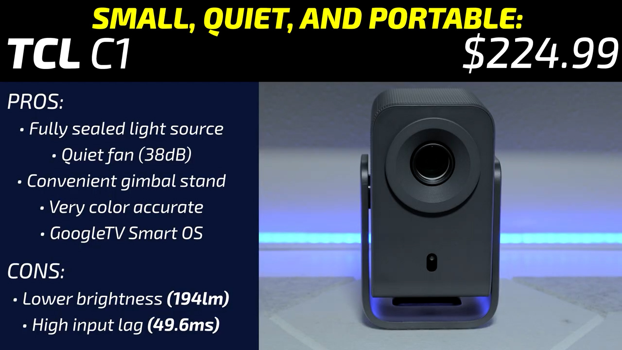 If you’re looking for a smaller, quieter, more portable option, I also like the TCL C1, but I would avoid it for video games and screens larger than 90 inches since it lacks the brightness to make a high-quality image on larger screen sizes. But I do really like the fully sealed light engine, and I look forward to hearing long term testing feedback from users about whether dust still found its way into the projector.