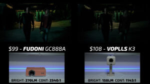 In round 2, the Fudoni is on the left and the $108 VOPPLs K3 is on the right. You can see that the VOPPLs never stood a chance, and despite specifically advertising 350 REAL ANSI lumens on the product page, it actually produced around 150 ANSI lumens, making the image much flatter and less interesting during bright scenes. It also had one of the worst contrast ratios resulting in almost unwatchable dark scenes, so the Fudoni easily won this round also.