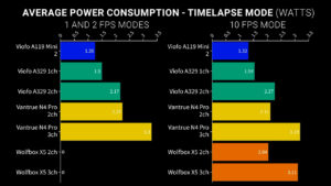 All four cameras have timelapse mode which constantly records at a lower framerate, and the Vantrue and Viofo let you choose the frames per second, while the Wolfbox always uses 10 FPS, and here are the power draw numbers for those modes.
