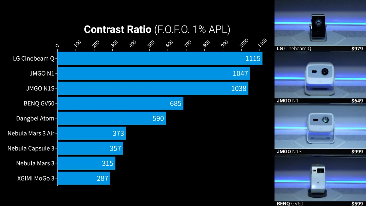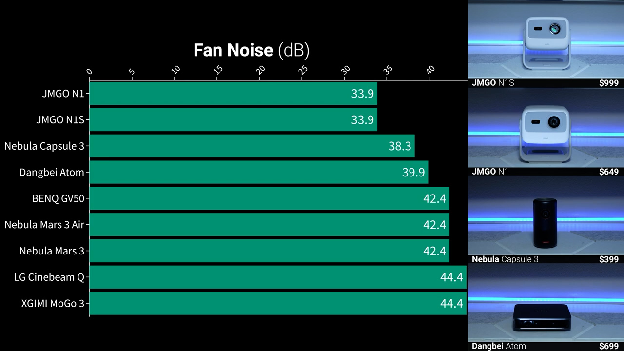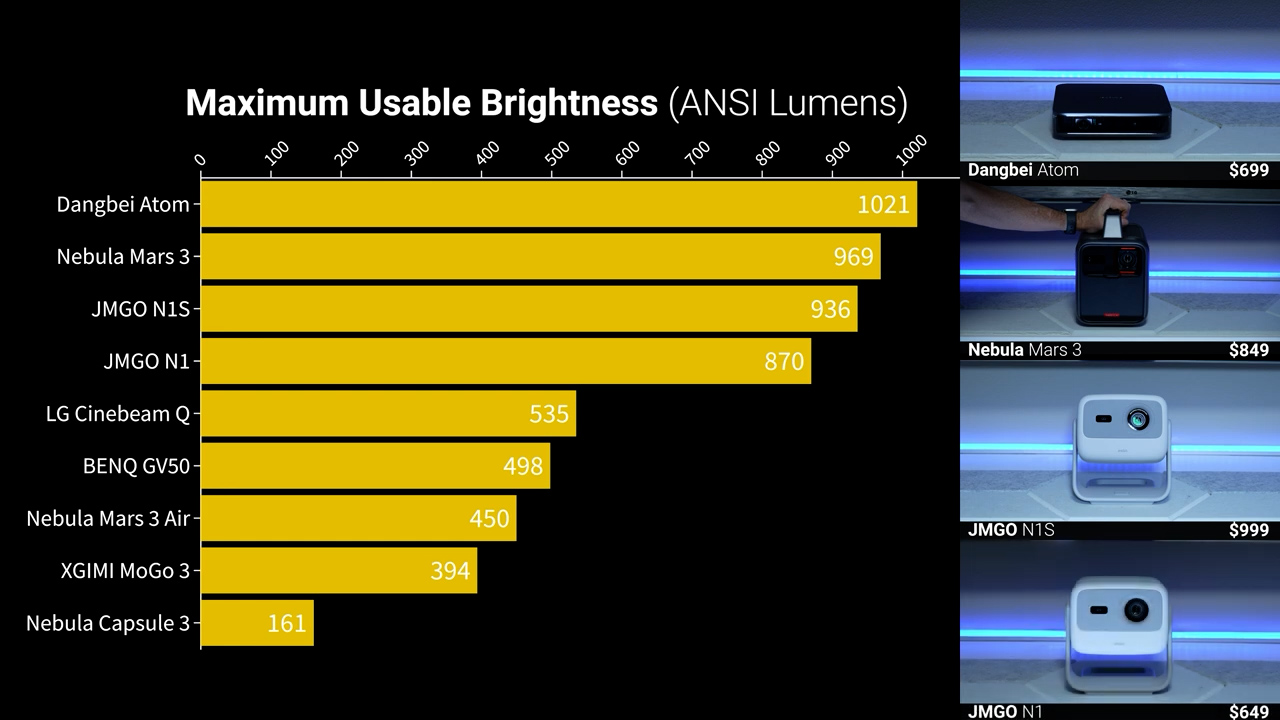 So that means that overall, the brightest projectors were the Dangbei Atom, Nebula Mars 3, JMGO N1S and JMGO N1. The projectors with the best contrast were the LG Cinebeam Q, JMGO N1, JMGO N1S, and the BENQ GV50, and the quietest projectors were the JMGO N1S, JMGO N1, Nebula Capsule 3, and Dangbei Atom.