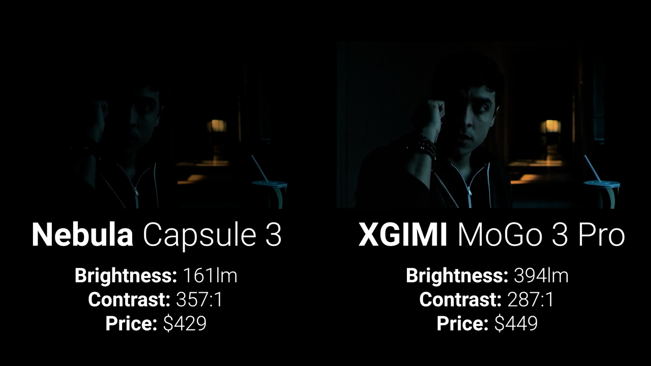 Starting with the two least expensive projectors, the Nebula Capsule 3 on the left and the XGIMI MoGo 3 Pro on the right, and to be perfectly honest, the 161 lumen max brightness on the Capsule 3 is not even close to enough for a 100” screen no matter how dark the room is. Bright scenes lacked enough overhead to properly show highlights and colors looked flat and lacked any vibrancy. In dark scenes, the raised black floor of the MoGo 3 Pro was evident but at least you could see what was happening, which couldn’t be said for the Capsule 3, which as I said is really only suitable for a 40-50” screen.