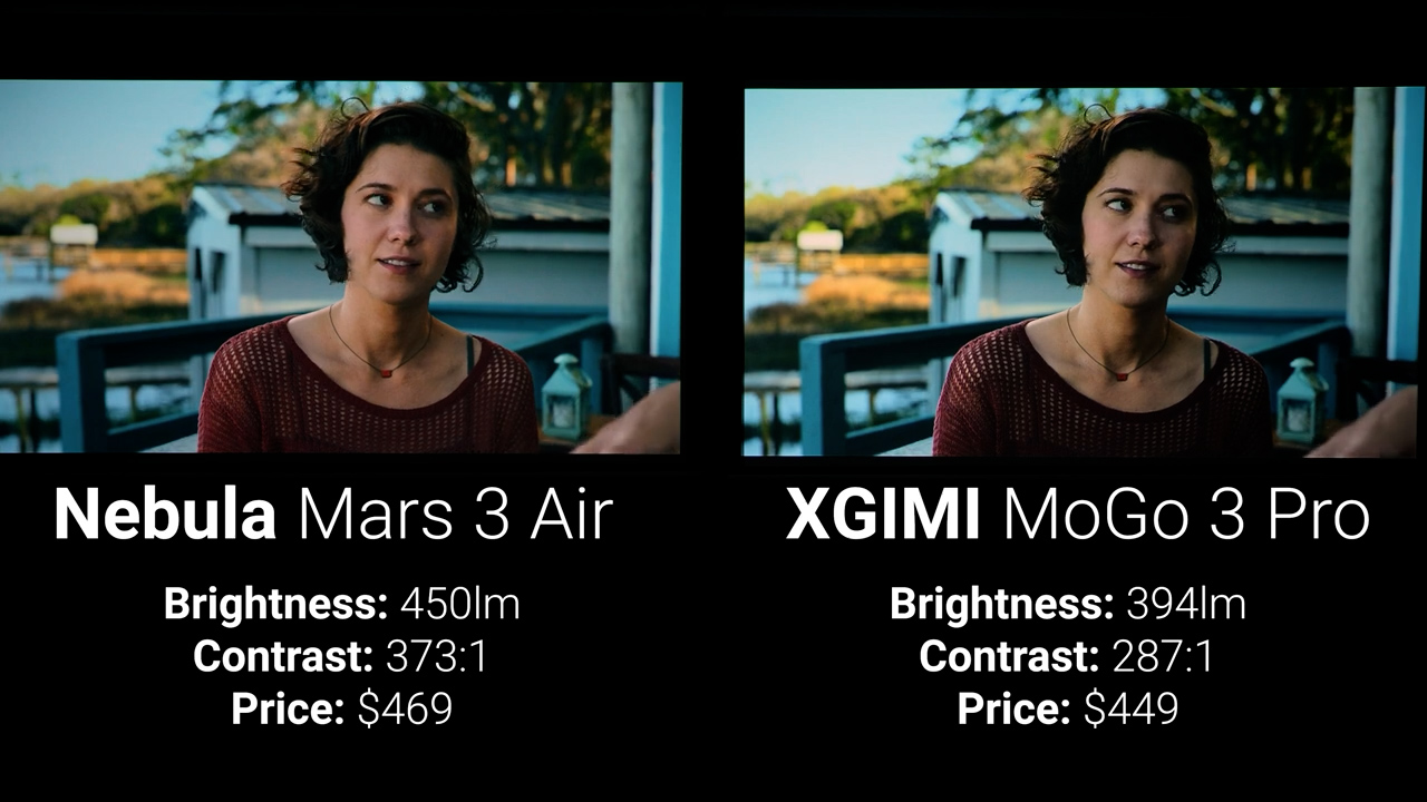 So round 2 put the Nebula Mars 3 Air on the left and the XGIMI MoGo 3 Pro on the right, and despite the Mars 3 Air having higher peak brightness in my testing, in actual content the MoGo 3 Pro looked brighter and more vibrant. The Mars 3 Air’s black floor and contrast were noticeably better in dark scenes, but the tone mapping on the XGIMI was slightly better and avoided crushing shadow detail despite the muddy black levels. This round was mostly a toss-up, but I ultimately decided to move the XGIMI on based on watching some golf where the XGIMI not only had more vibrant colors, but also looked sharper and had better motion handling.