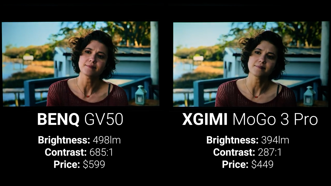 So round 3 had the BENQ GV50 on the left and the XGIMI MoGo 3 Pro on the right, and to say that I was impressed with the GV50’s picture would be a huge understatement. During bright scenes, the difference in detail in Henry’s face and shirt are what I would expect to see when comparing a 4K projector to 1080p, but both of these projectors have the same resolution. In dark scenes the BENQ’s tone mapping was just as good as the XGIMI, but with a two times lower black floor, meaning the same amount of shadow detail was visible on both projectors, but the BENQ avoided the muddy gray black levels you can see on the XGIMI, so this was an easy win for the BENQ.