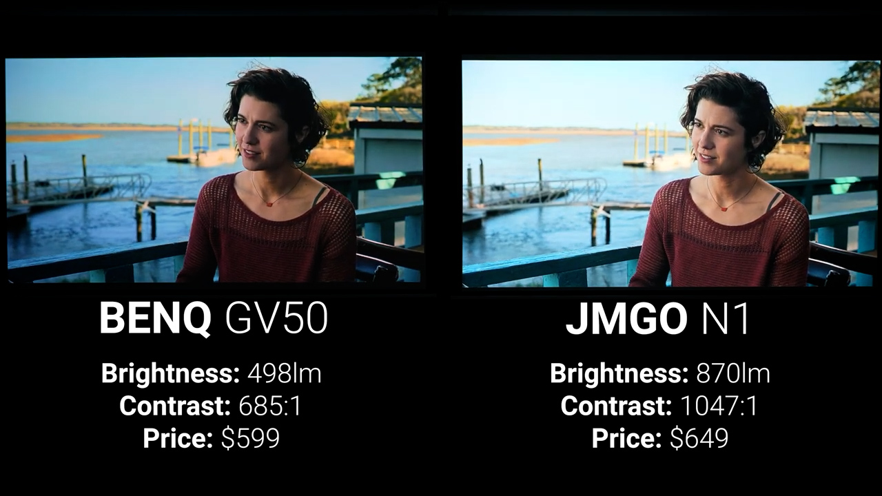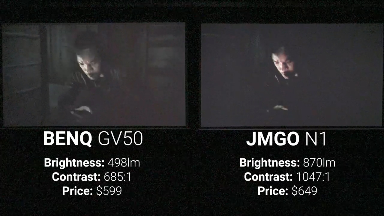 In the last round the BENQ GV50 is on the left and the new JMGO N1S is on the right, and the N1S was absolutely awesome and was basically the perfect combination of increased shadow detail like the Nebula Mars 3 combined with twice the brightness and a better contrast ratio than the GV50. Although the JMGO N1S is almost twice the price of the GV50, it might be nearly twice as good when it comes to picture quality, and it was an absolute pleasure to watch with one exception: if you get really close to the screen during dark scenes you can see individual flashes of the red laser that look like tiny ants crawling on the screen, which you can kind of see when I crank the exposure, but from a normal viewing distance these weren’t noticeable to me at all and didn’t take away from the overall picture quality.