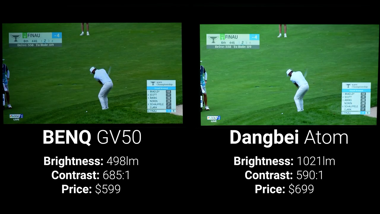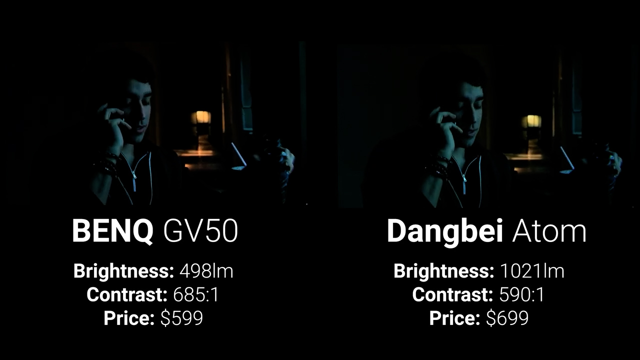 And now in Round 5 the BENQ GV50 is on the left and the brightest projector in this video, the Dangbei Atom is on the right. The story was very similar to the previous round with the Dangbei looking bright and vibrant in brighter scenes, but even with lower overall brightness, the BENQ seemed to be sharper and had more detail in darker areas like Henry’s shirt and Danny’s hair, and I’m specifically not judging these portable projectors based on cinematic D65 white point color accuracy, but the BENQ did a much better job reproducing different skin tones, and in dark scenes the Atom did a better job than the JMGO when it came to reproducing shadow detail, but at the cost of muddy and gray blacks. The final nail in the coffin for the Atom was the motion handling in 1080p60Hz content where I felt like fast motion was ever so slightly choppy compared to the BENQ.
