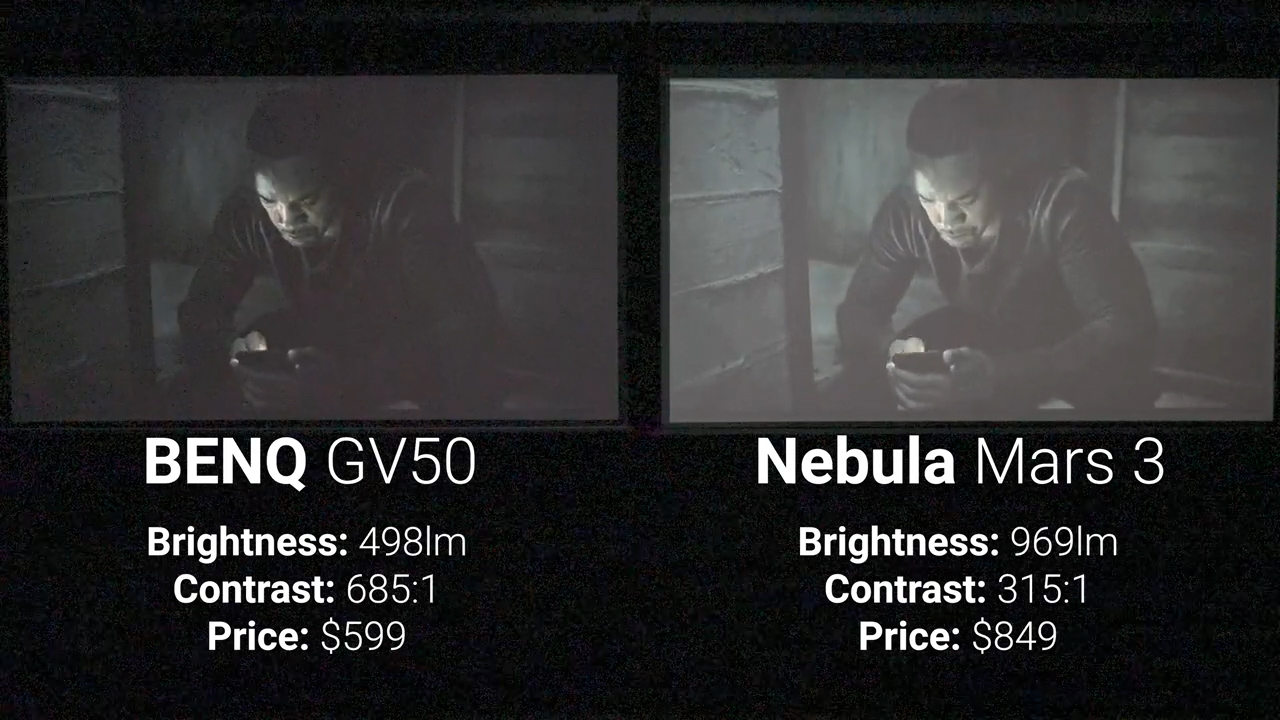 So round 6 puts the BENQ GV50 on the left and last year’s overall picture quality winner, the Nebula Mars 3 on the right, and what it boils down to is that these projectors are not made for the same purpose. The brightness and tone mapping on the Mars 3 make it absolutely ideal for projecting onto imperfect surfaces, and while the black levels are kind of terrible and the image isn’t necessarily true to what the director intended, it’s just generally easy to watch and it’s almost like extra lighting gets added to every scene, which again is something you’ll appreciate if you’re projecting onto imperfect surfaces with imperfect lighting control. That said, for this test in a dark room, the BENQ was still just about as good as I could ask for with great tone mapping, sharpness, and shadow detail without muddy gray black levels.
