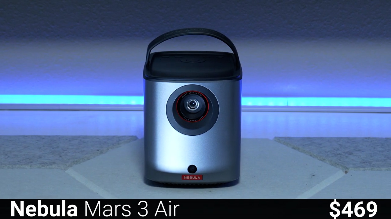 Next for $469 is the 1080p Nebula Mars 3 Air, which has a very similar form factor to one of my previous favorite portable projectors, the Nebula Mars 2 Pro. The Mars 3 Air weighs in at 3.7 pounds and has a built in battery that Nebula claims will last 2.5 hours. For connectivity, the Mars 3 Air has a 3.5mm audio jack, a full size HDMI port, USB-A, and a barrel jack that uses 19V DC for power. Nebula claims the Mars 3 Air has a brightness of 400 lumens and I measured 12% higher than that at 450 ANSI lumens on full brightness and 203 ANSI lumens on battery saver Eco mode. The black floor of the Mars 3 Air was slightly lower than the XGIMI resulting in a contrast ratio of 373:1, and the fan noise was also slightly lower at 42.4 decibels.
