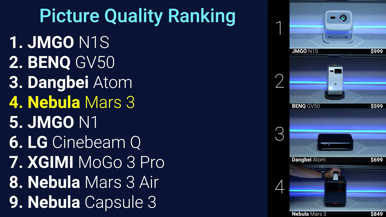 After all that testing here are the final rankings for picture quality, with the JMGO N1S in first, BENQ GV50 in second, and Dangbei Atom in third, though I still think that the Nebula Mars 3 is probably the best for viewing in an area with some ambient light.