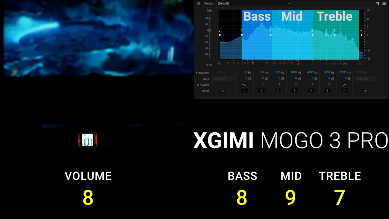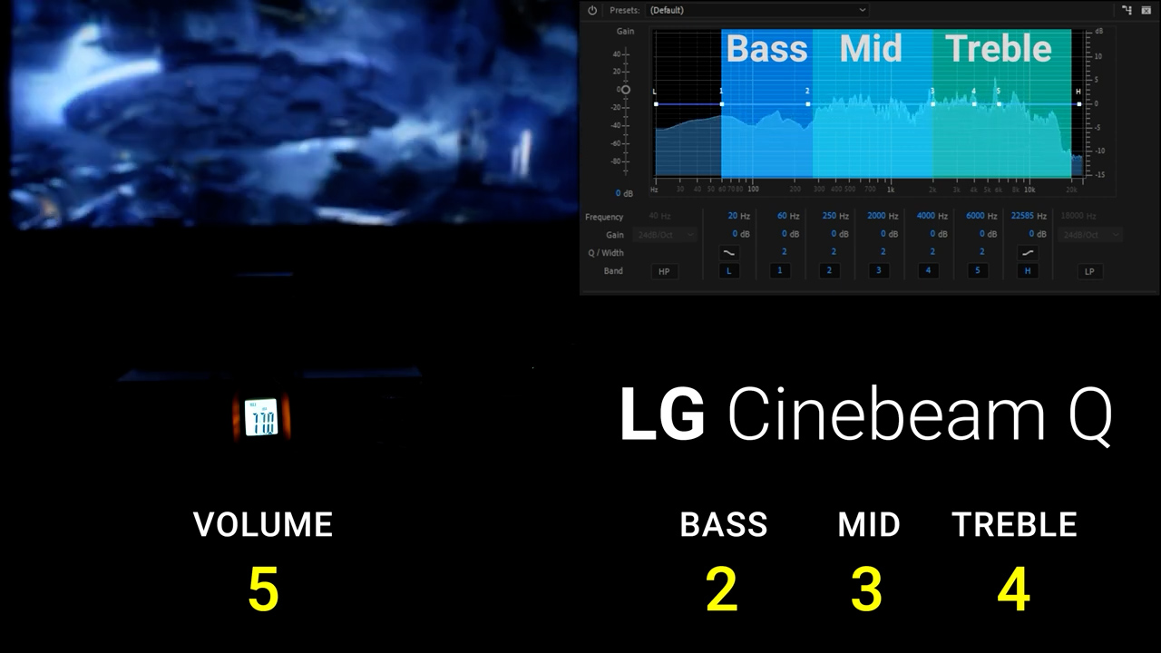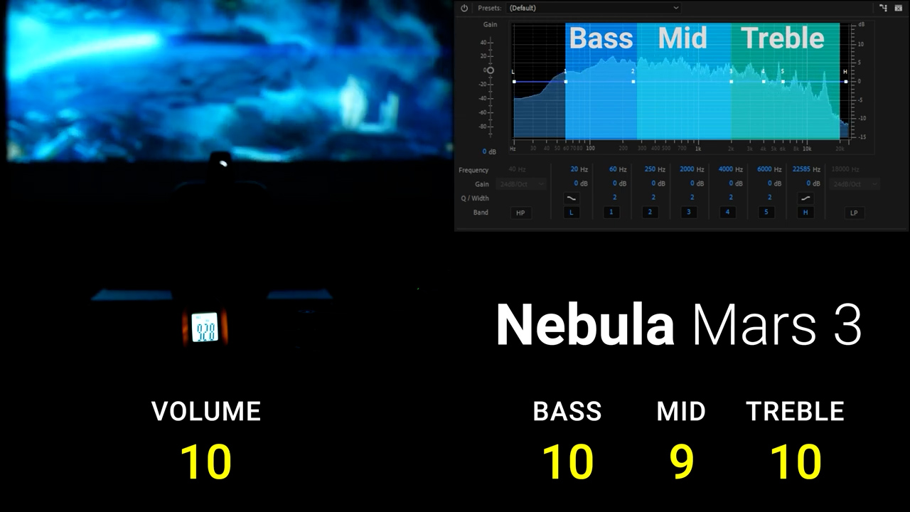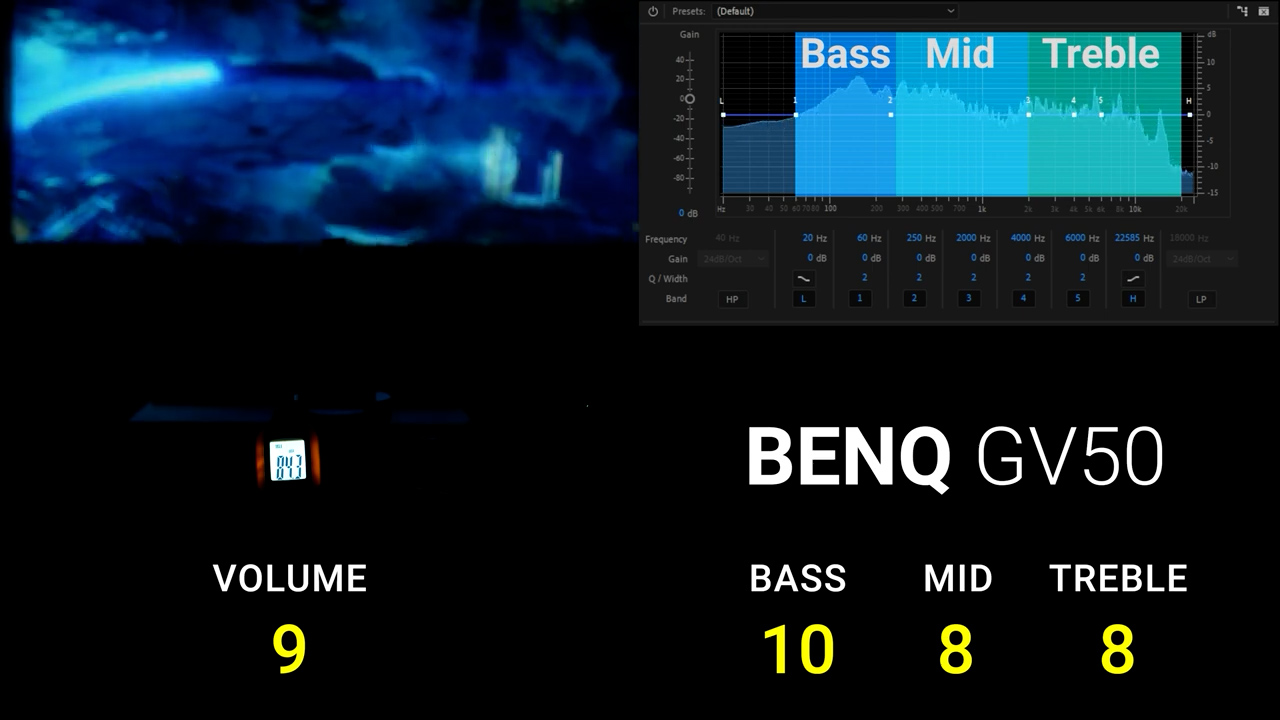 Because these projectors are meant to be portable it’s also important that they have built in speakers that are not only loud enough, but also high enough quality that you’d want to use them. To test sound quality, I played the same clip from Star Wars Episode 9 on max volume and measured the peak audio level in decibels and have also overlayed a frequency response graph divided into three sections for bass, midrange, and treble.