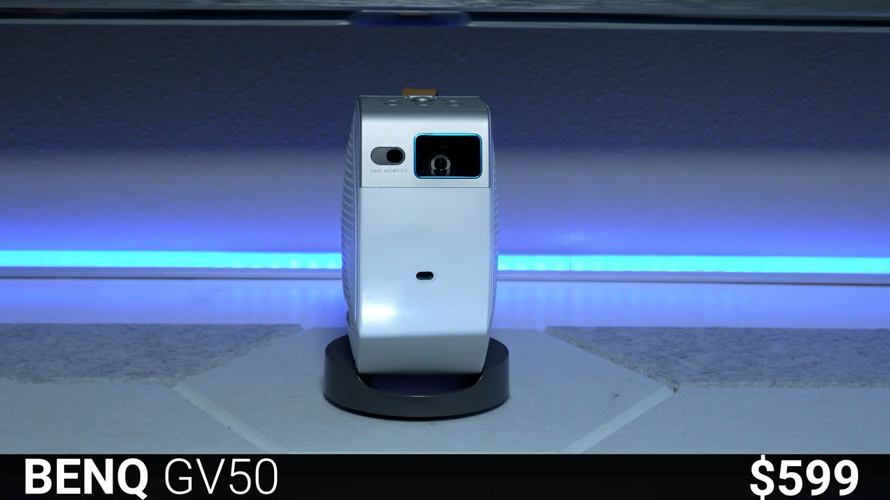 After that for $599 is the brand new 1080p BENQ GV50 which, like the GV30 and GV31 before it, has a circular design with a magnetic base to be able to easily aim anywhere you want. The GV50 has all plastic construction, weighs in at a hefty 4.6 pounds, and has a built in battery that BENQ says will last up to 2 and a half hours. For connectivity, the BENQ has a 3.5mm audio jack, USB-A, a full size HDMI, USB-C with PD, and a Barrel jack for 19V DC charging. The GV50 has massively upgraded brightness from previous models at a claimed 500 lumens, and I measured 498 ANSI lumens when plugged in and 369 ANSI lumens in battery saver Eco mode. The GV50 also had a low black floor giving it a respectable contrast ratio of 685:1 and the fan noise was the same as the Mars 3 Air at 42.4 decibels.