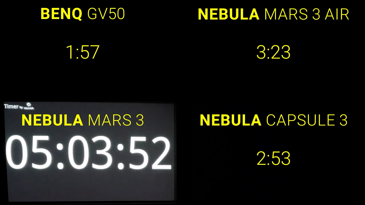 And the first are the projectors with built-in batteries which are the Nebula Capsule 3, Nebula Mars 3 Air, BENQ GV50, and Nebula Mars 3. I found that on battery mode, the BENQ had the shortest battery life outputting 369 lumens for 1 hour and 57 minutes. The Nebula Capsule 3 output 112 lumens for 2 hours and 53 minutes. The Nebula Mars 3 Air output 128 lumens for 3 hours and 23 minutes, and the Nebula Mars 3 put out a respectable 344 lumens for an impressive 5 hours and 4 minutes, and even on max brightness outputting close to 1000 lumens, the Mars 3’s battery lasts 1 hour and 58 minutes.