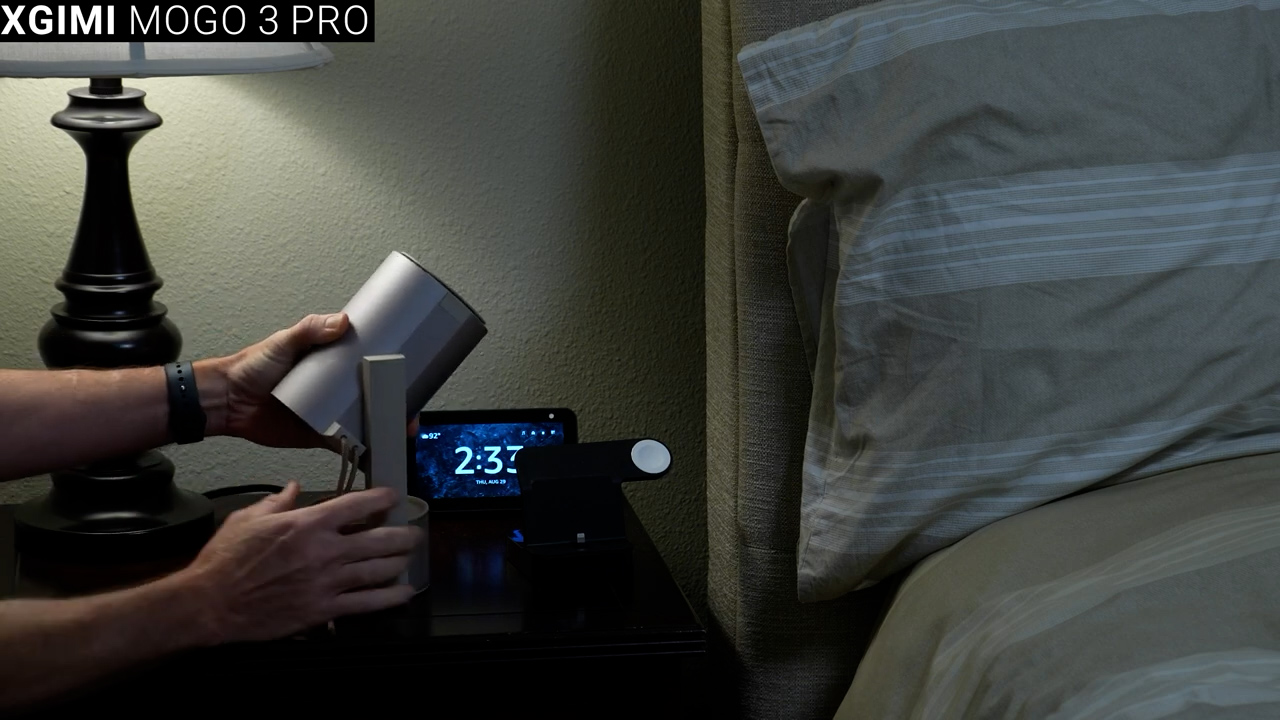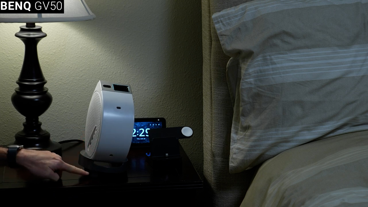 And you can see that even though the auto keystone was a miss, after manual setup, the extra roll from the GV50’s base let me project a slightly larger screen from the exact same location on the nightstand even though all these projectors have the same throw ratio, and the higher contrast and lower black floor also meant that the non-keystoned projected border was less visible than it was with the XGIMI.