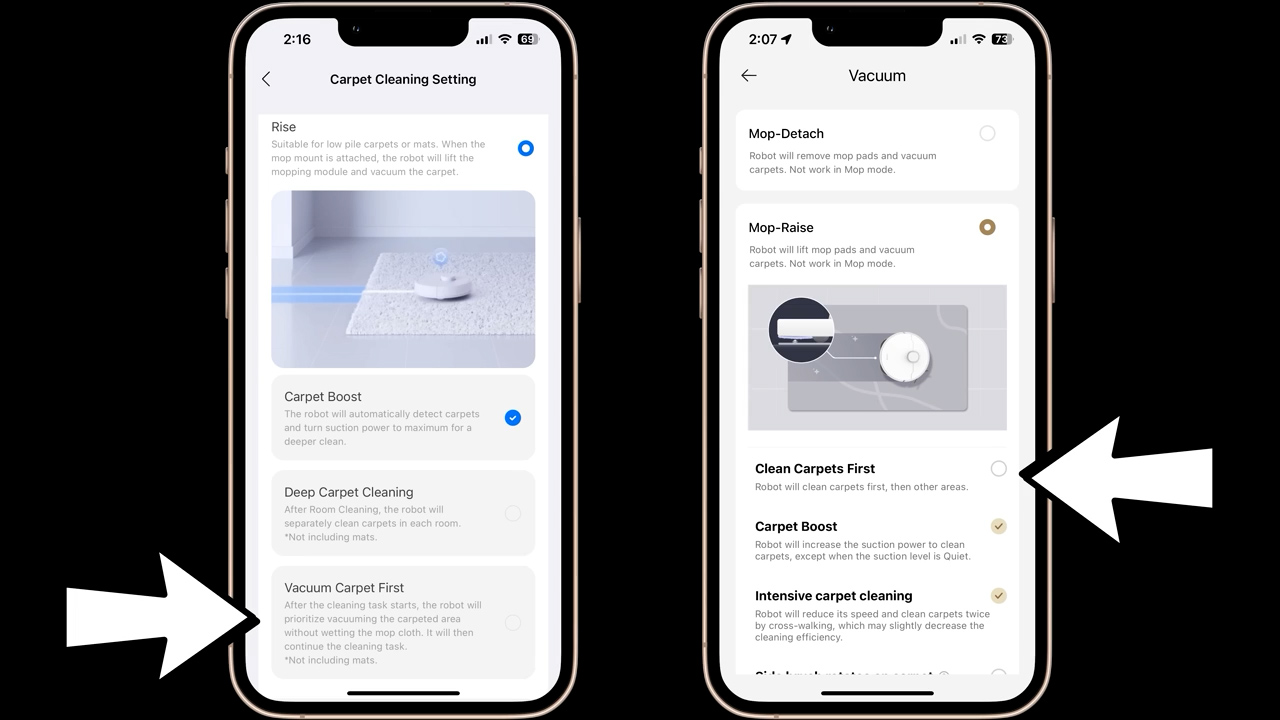 I also measured the ability for each robot to lift its mopping pads when traveling over carpet and found that all of the vacuums got the edges of the carpet wet when transitioning between the hard floor and the carpet and only the Dreame X50 Ultra, 3i S10 Ultra, and eufy S1 Pro could vacuum my high pile carpet with a retracted wet mop and not get the carpet wet. However, this is becoming a much less common issue because all the apps allow you to manually set a room cleaning order, so you can have them vacuum carpets first before mopping. The Dreame X50 Ultra and Roborock Saros 10R can go one step further and leave their mopping pads at the base station while cleaning your carpets, so the only reason you’d need to use mop lift at all is if you have a carpeted area in between rooms that you want mopped and there’s no alternate route for the robot to take.