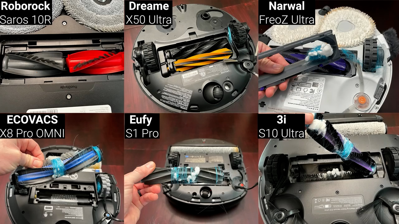 Those results were overall not great, but in this test the Roborock Saros 10R came away with absolutely zero tangles, the Dreame X50 Ultra had zero tangles in the brush, but a small clump on the wheel axel, and the Narwal’s cone shaped brush did the exact same thing that it did in the last test, funneling all the hair to the end of the brush where it clumped and failed to go into the dustbin. The traditional bristle brushes on the ECOVACS and 3i ended up with tangles in the middle of the brush that couldn’t be scraped away by the detangling combs, and the eufy S1 Pro’s rubber brush also had a tangle in the middle but I’m confident it would have eventually migrated into the space by the side axel to be cleaned during routine maintenance.