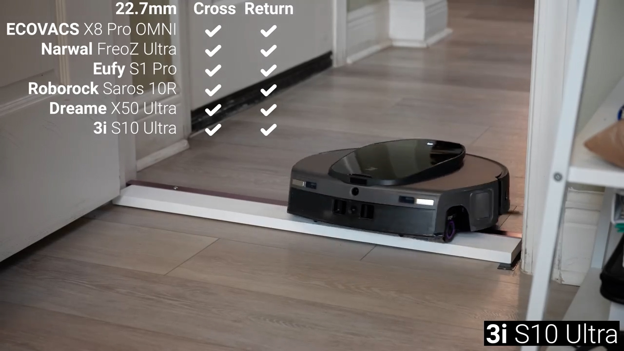 Moving up to a 35 mm threshold, the 3i, eufy, Narwal, and ECOVACS didn’t really even try to cross, the Roborock was able to cross the ramped side but got stuck on the flat side, and the Dreame X50 Ultra easily crossed in both directions.