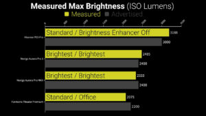 Brightness is one of the most important aspects of a projector, but projector manufacturers don’t make it easy to figure out what their advertised brightness actually means. Standardization to ISO lumens was a good first step, where nine individual brightness readings are taken using a template, then averaged and multiplied by the screen size in square meters. But most projectors have a bunch of different picture modes, and the brightest one used for all the advertising numbers is almost never the one you’d want to use because of poor contrast, color accuracy, and fan noise.