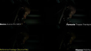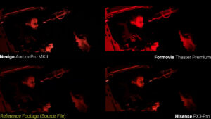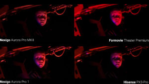 When the lights go out the Aurora Pro 1 actually did the best job with shadow detail, maintaining some of the highlights on the back wall, and the Aurora Pro 2 had the biggest brightness difference between the darkest parts of the scene and the saber strikes, but the Aurora Pro 1 and Hisense PX3-Pro were more true to the source during those bright portions. Again, you can see that the Formovie Theater Premium was just nowhere close to correct in terms of color since it’s using the wrong color space for the content, but it does look kind of cool.
