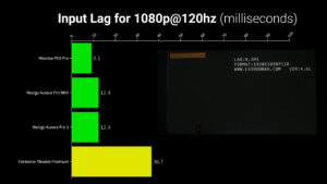 And at 4K60Hz the PX3-Pro, Aurora Pro 1, and Aurora Pro 2 had 17.6 ms of input lag, which is about 1 ms higher than the lowest possible single frame input lag of 16.7 ms and the Formovie theater was 1 ms higher than that at 18.3 ms total. But for 1080p120Hz the PX3-Pro was quite a bit better at 9.1 ms compared to 12.4 ms on the NexiGo AP1 and AP2, and the Formovie Theater Premium doesn’t output true 1080p120Hz and as a result the input lag numbers bounced between 30 and 45 milliseconds depending on which frames were being dropped. At 240Hz the PX3-Pro had an impressively low 4.6 ms of input lag while the NexiGo projectors had inconsistent readings between 8 ms and 12 ms indicating occasional dropped frames, and the Formovie bounced between 24 ms and 32ms. In other words, the PX3-Pro is the easy choice for gaming, and if you have the Formovie you should only use 4K60Hz because all the other refresh rates give worse performance.