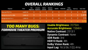 The Formovie Theater Premium was a little disappointing for me, coming in with lower brightness and lower native contrast than the original Aurora Pro, with no dynamic dimming, buggy 120 and 240Hz output, and the inability to correctly display Dolby Vision content with the correct color space definitely doesn’t seem like a projector that should command a $2800 price tag.