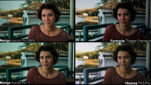 The first obvious question to ask is which one looks the best, as in which is the most eye catching and usually that’s mostly the result of brightness and intra-scene contrast. If I stop on a random frame, you can see that all the projectors look pretty good, but the Formovie Theater Premium has crushed some shadow detail in Dani’s hair, and the PX3-Pro has a lot more brightness in the patch of sky in the upper left corner. Sometimes it’s difficult to judge color accuracy when there are four similar images side by side, but to me the skin tones look the best on the PX3-Pro and Aurora Pro MK2 with the Formovie Theater Premium leaning a bit too pink and the Aurora Pro 1 looking a little blotchy. Bringing in the reference footage which is the raw video file not being played by any device, you can see that the PX3-Pro pretty much nailed it in terms of skin tone accuracy and tone mapping. But none of them handled the patch of sky particularly well and the Aurora Pro 1 and MKII were a bit dim while the PX3-Pro was too white and too bright, and I think the Formovie Theater Premium was the closest to the source in terms of background colors.