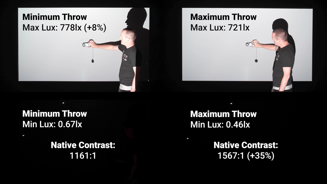 Even before you turn the projector on, you have an important decision to make because you may know that the Valerion has a 1.6x optical zoom, meaning it can project a 100” screen from anywhere between 80” and 130”. But what you might not know is that having the projector close to the screen at its minimum throw ratio will cause the image to be about 7-8% brighter, but having the projector farther away at is maximum throw ratio results in a significant increase in contrast of between 25% and 35%, which is a great tradeoff for less than 10% decrease in brightness. So, my recommendation is to always use the Valerion Pro 2 at its maximum throw ratio if your room allows for it.