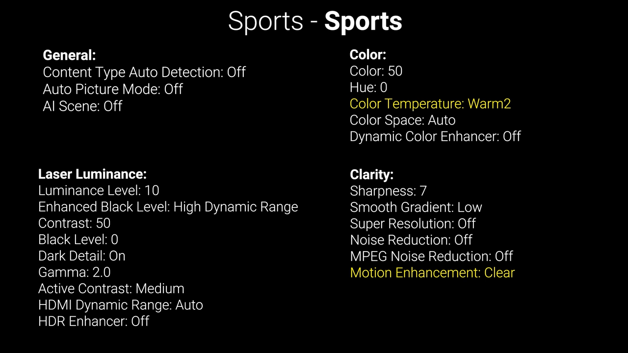 Here are my settings for watching sports in SDR, with the main difference being the color temperature, which I set to the slightly cooler Warm2 white point, and Motion Enhancement, which I set for maximum clarity since cinematic motion blur isn’t something you want to see in a football game.
