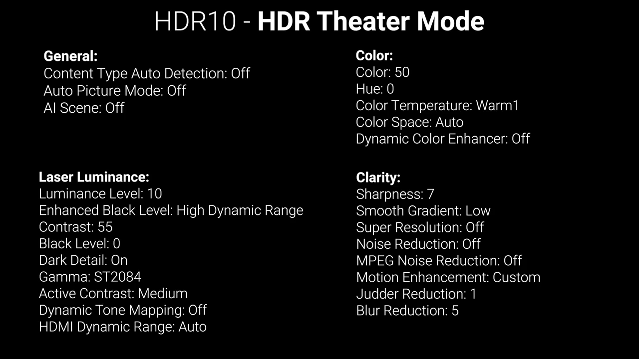 If you’re watching HDR content, all the menus are mostly the same except inside of the Laser Luminance menu the Gamma value is locked to something called ST2084 which aims to give the biggest differences between the darkest and brightest areas but can cause moderately lit areas to look a little flat. The most important option for HDR is Dynamic Tone Mapping, which will map the dynamic range of your content to a level that your projector can actually produce, and you absolutely want to have this option on, otherwise you’ll see massively blown out highlights in every bright scene.